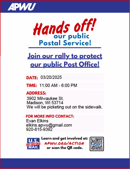 Categories Uncategorized Madison, March 20, 2025: HANDS OFF THE PUBLIC POSTAL SERVICE! – Informational Picket Post author By WiBOPM Post date March 17, 2025 Share this: Click to share on X (Opens in new window) X Click to share on Facebook (Opens in new window) Facebook Like Loading... Related ← Madison, April 5, 2025: Immigration & Labor Training Series → Ansarallah Responds to US Strikes, Targets American Aircraft Carrier