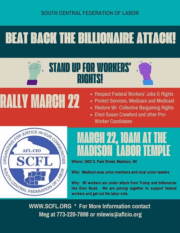 Saturday, March 22, 2025 10am: Beat Back the Billionaire Attack Rally (Workers Rights) at the Madison Labor Temple grounds.