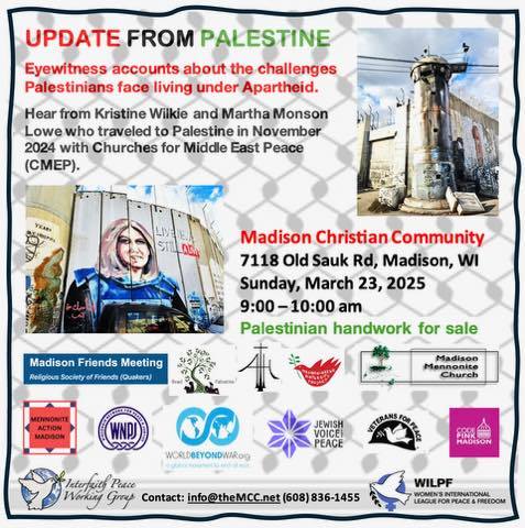 Categories Uncategorized Madison, March 23, 2025: Update From Palestine! Post author By WiBOPM Post date March 17, 2025 Share this: Click to share on X (Opens in new window) X Click to share on Facebook (Opens in new window) Facebook Like Loading... Related ← Ansarallah Responds to US Strikes, Targets American Aircraft Carrier → Madison, March 29, 2025: 4th Annual Trans Day of Visibility