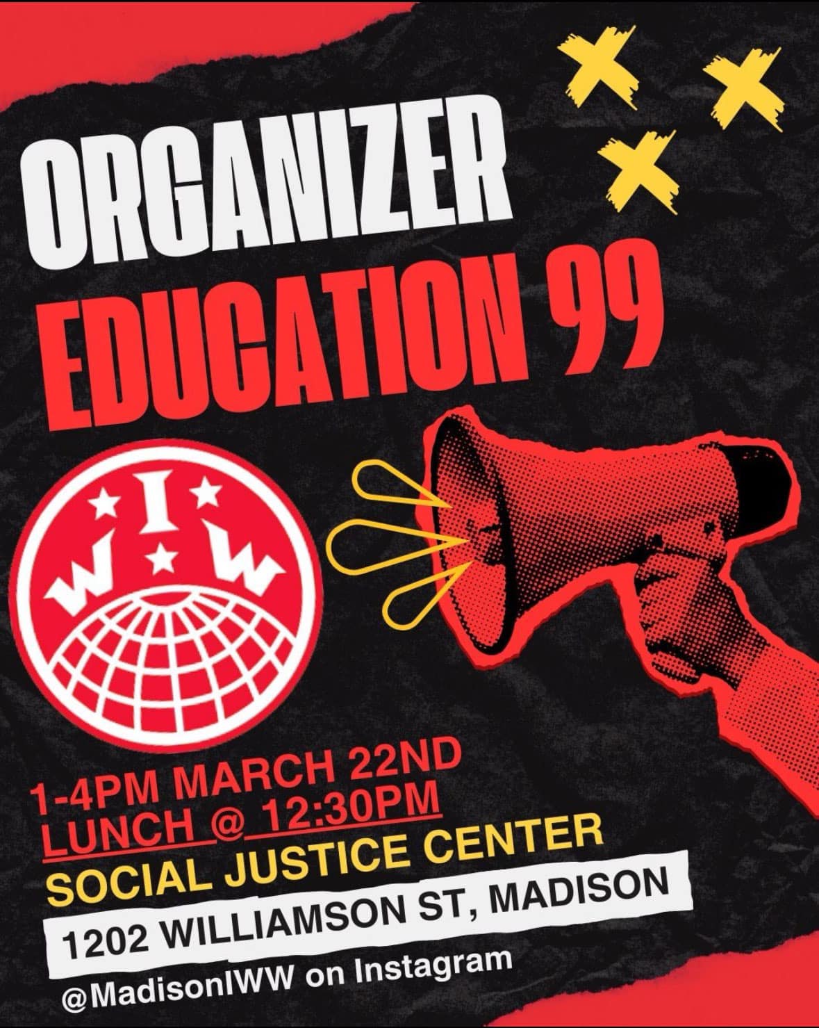 Categories Uncategorized Madison, March 22, 2025: Organizer Education Workshop Post author By WiBOPM Post date March 19, 2025 Share this: Click to share on X (Opens in new window) X Click to share on Facebook (Opens in new window) Facebook Like Loading... Related ← Solidarity With Flight Attendants at United! Union, YES! → Madison, March 23, 2025: Hell NO! To Dismantling the Postal Service!