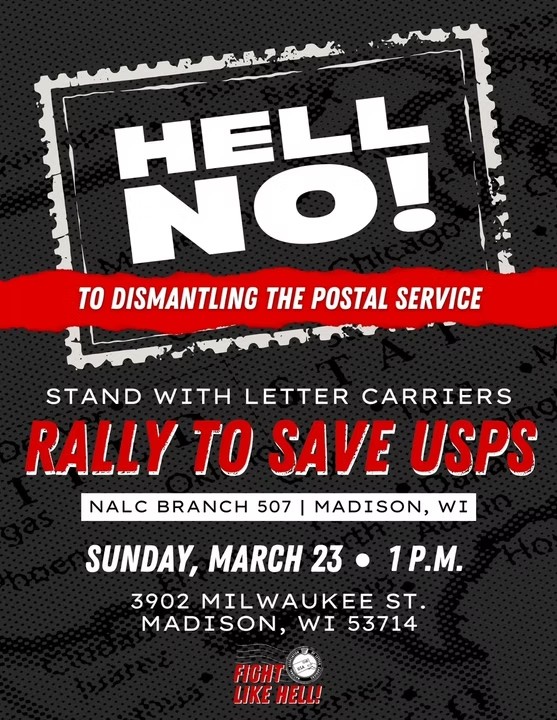 Categories Uncategorized Madison, March 23, 2025: Hell NO! To Dismantling the Postal Service! Post author By WiBOPM Post date March 19, 2025 Share this: Click to share on X (Opens in new window) X Click to share on Facebook (Opens in new window) Facebook Like Loading... Related ← Madison, March 22, 2025: Organizer Education Workshop → Madison, March 22, 2025: Beat Back the Billionaire Attack! Stand Up For Worker’s Rights! – Rally!