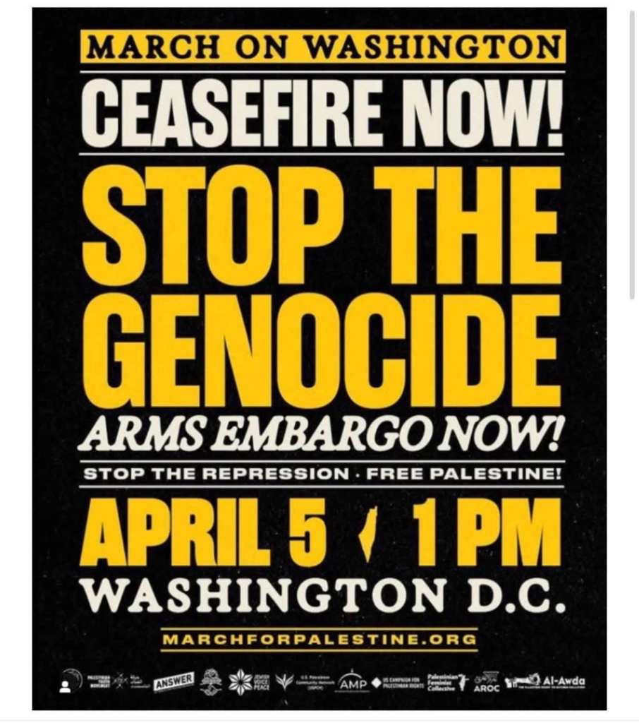 Categories Uncategorized Washington D.C., April 5, 2025: Stop the U.S.-Israel Genocidal Apartheid! Arms Embargo Now! Free Palestine! Post author By WiBOPM Post date March 24, 2025 https://marchforpalestine.org/ Share this: Share on X (Opens in new window) X Share on Facebook (Opens in new window) Facebook Like Loading... Related ← Tens of thousands in France join protests against racism and far right → Rest In Peace Hossam Shabat