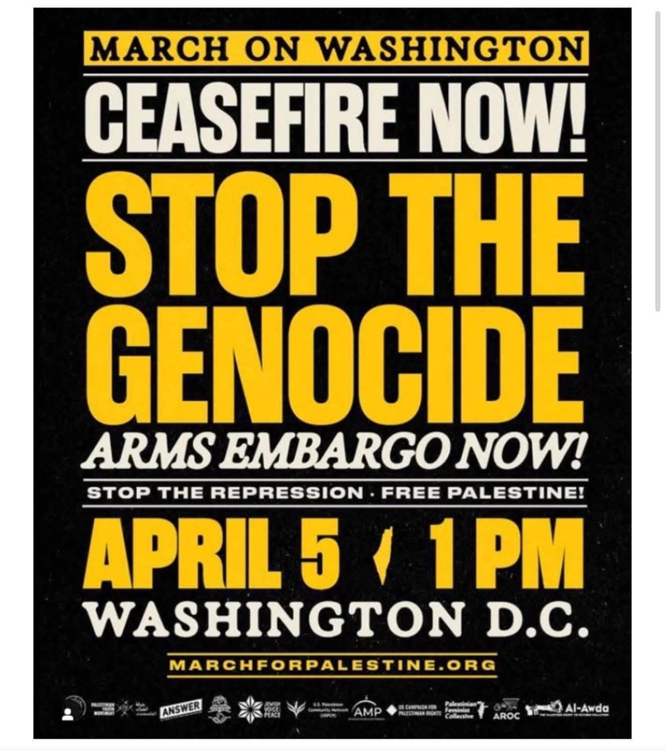 Categories Uncategorized D.C., April 5, 2025: Stop the U.S.-Israel Genocide! March on Washington! Arms Embargo! People’s Needs Not Endless U.S. Wars! Post author By WiBOPM Post date March 27, 2025 Share this: Click to share on X (Opens in new window) X Click to share on Facebook (Opens in new window) Facebook Like Loading... Related ← Madison, April 5, 2025: Read Palestine → Wisconsin: Joint Finance Committee Public Hearings – Demand a People’s Budget! Make the Banks Pay! – April 2, 4, 28 and 29, 2025