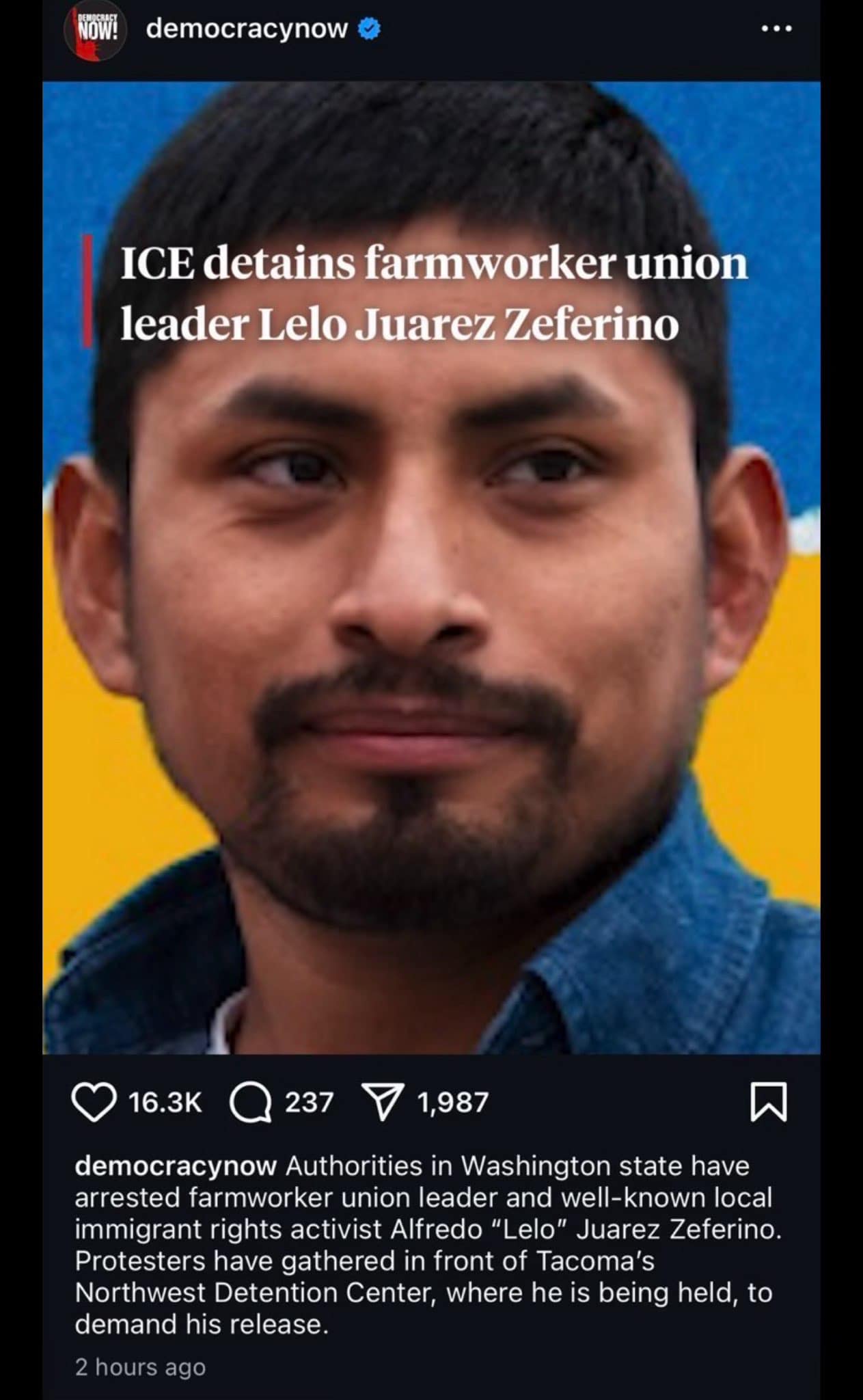 Categories Uncategorized ICE Kidnaps Another Union Leader: Lelo Juarez Zeferenio Post author By WiBOPM Post date March 27, 2025 Share this: Share on X (Opens in new window) X Share on Facebook (Opens in new window) Facebook Like Loading... Related ← Oscar-Winning Palestinian Filmmaker Hamdan Ballal Brutally Beaten in Mob Attack by Israeli Settlers, Then Kidnapped → SEIU Massachusetts State Council Denounces Detention of Tufts Graduate Student and SEIU 509 member Rumeysa Ozturk
