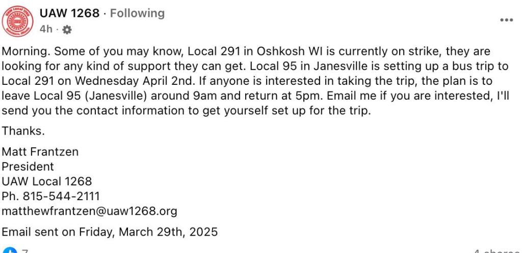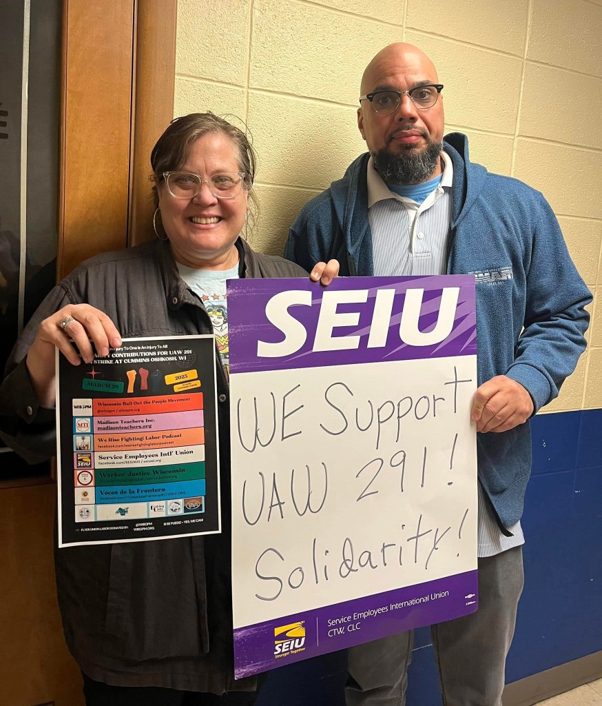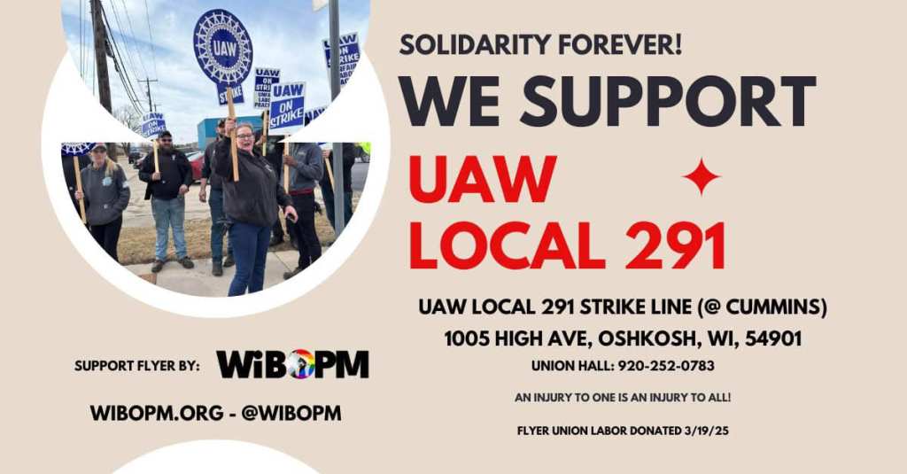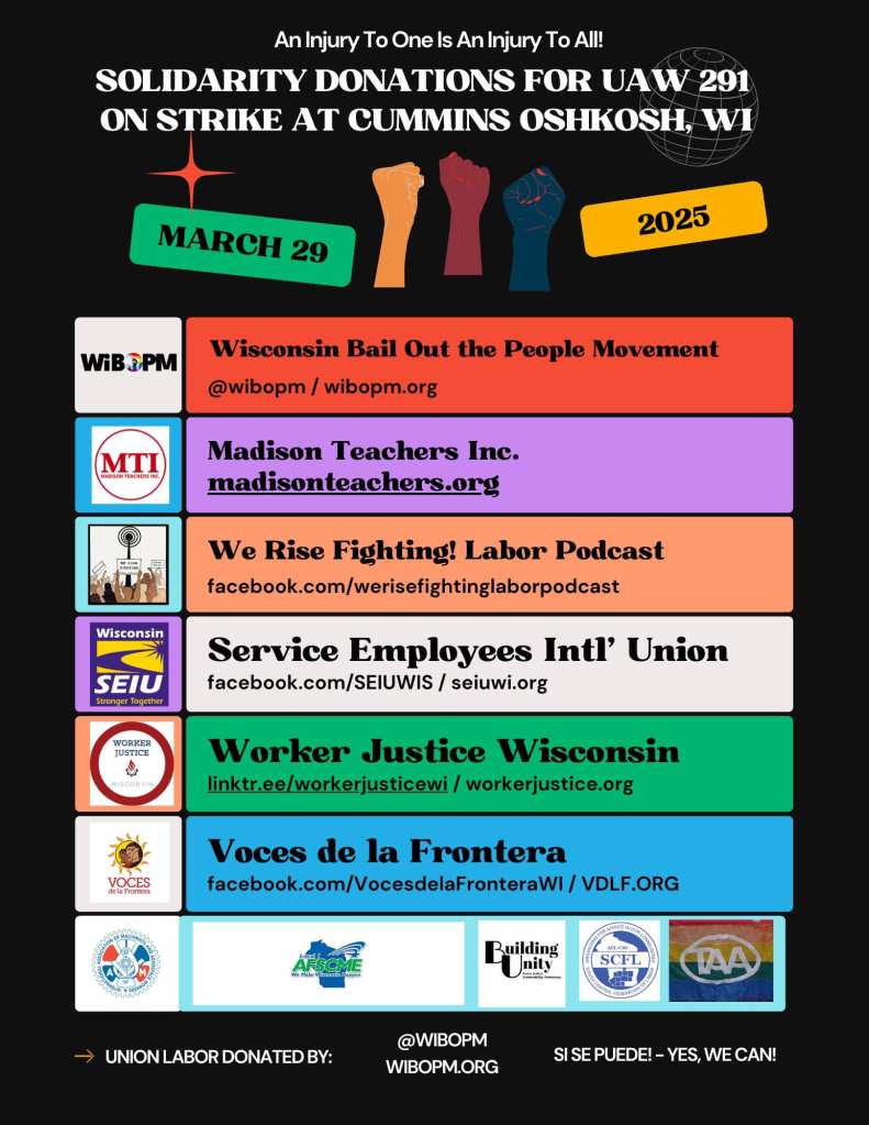 On March 29, 2025, labor and community supporters gathered supplies at the Madison Labor Temple for members of UAW Local 291 on strike at Cummins in Oshkosh, Wisconsin. A Steelworkers members is bringing the supplies to Oshkosh after picking up supplies at the Machinists Hall in Beaver Dam and at the Fond du Lac Labor Temple. Solidarity!