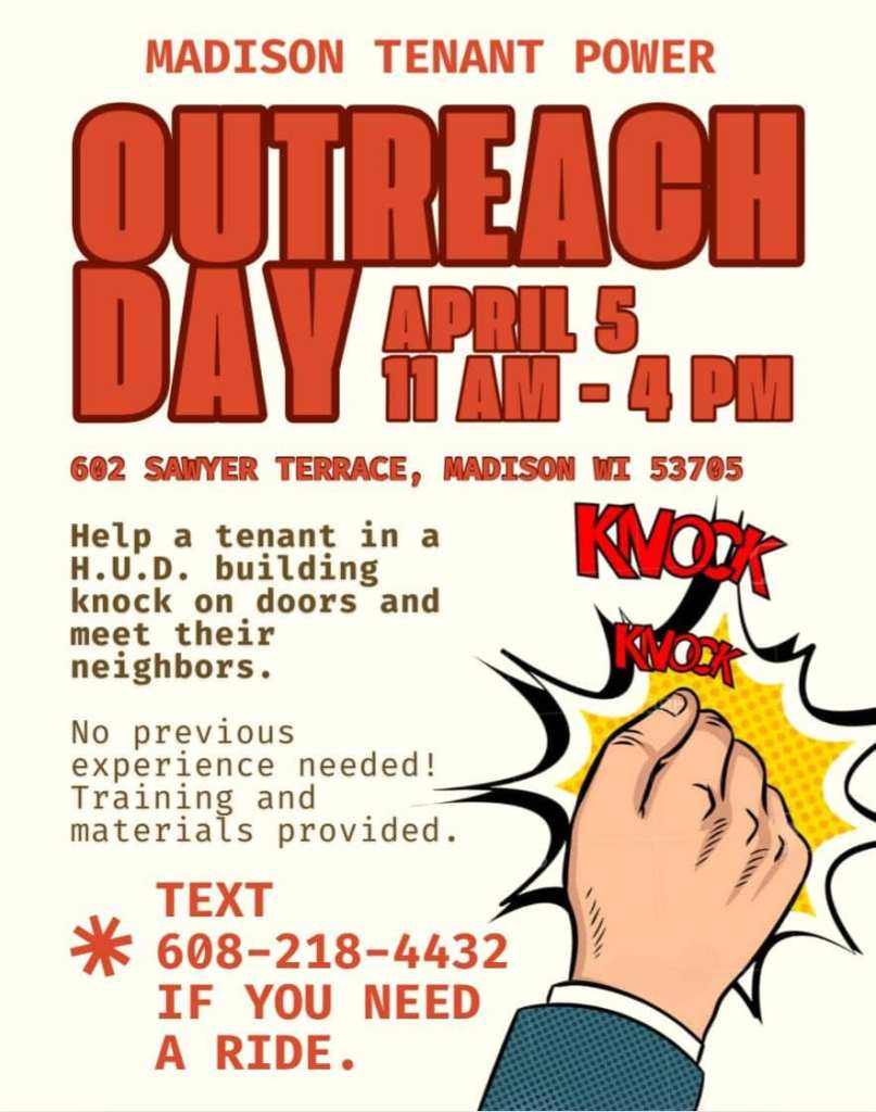 Categories Uncategorized Madison Tenant Power Outreach Day April 5, 2025 Post author By WiBOPM Post date April 1, 2025 Share this: Click to share on X (Opens in new window) X Click to share on Facebook (Opens in new window) Facebook Like Loading... Related ← Madison, April 13, 2025: No Cuts to V.A. Services! March → April 5, 2025 People’s Protests in Wisconsin – Crush Capitalism!