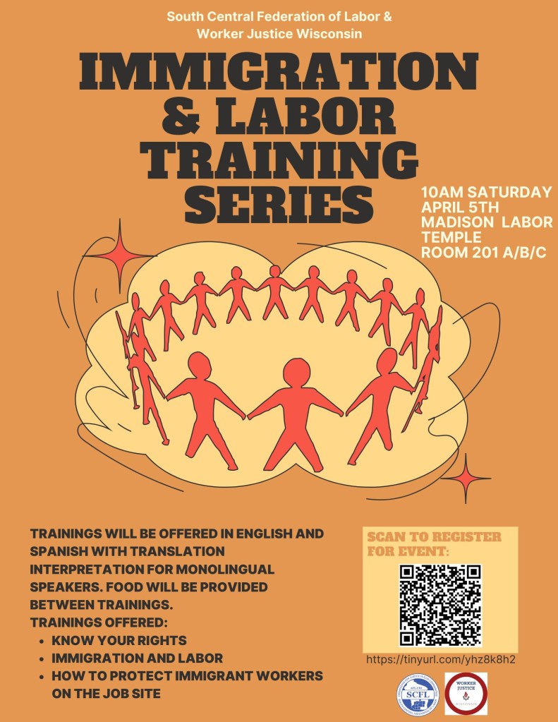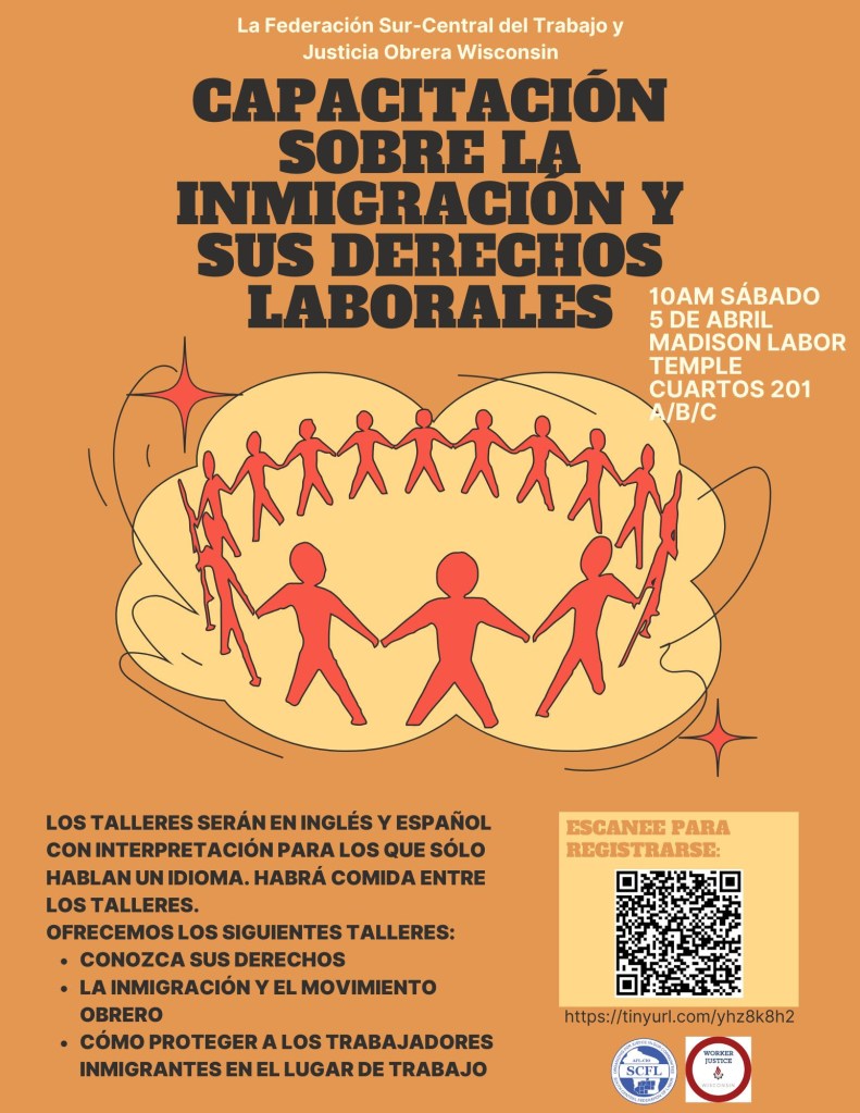 You are invited to attend Worker Justice Wisconsin and South Central Federation of Labor’s Immigration Rights Workshop on Saturday, April 5, at 10 am. To register, go here.