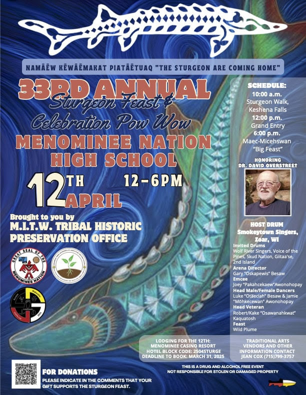 | April 12 10:00 a.m. – Sturgeon Walk, Keshena Falls 12:00 p.m. – Grand Entry 6:00 p.m. – Maec-Micehswan “Big Feast” https://calen dar.powwows.com/events/annual-sturgeon-feast-celebration-pow-wow/ Contact: Guy Reiter <anahkwet@hotmail.com>, Director of the Menominee Indian community organization, Menīkānaehkem, Inc https://www.facebook.com/p/Menikanaehkem-Community-Rebuilders-100064666452873/ |