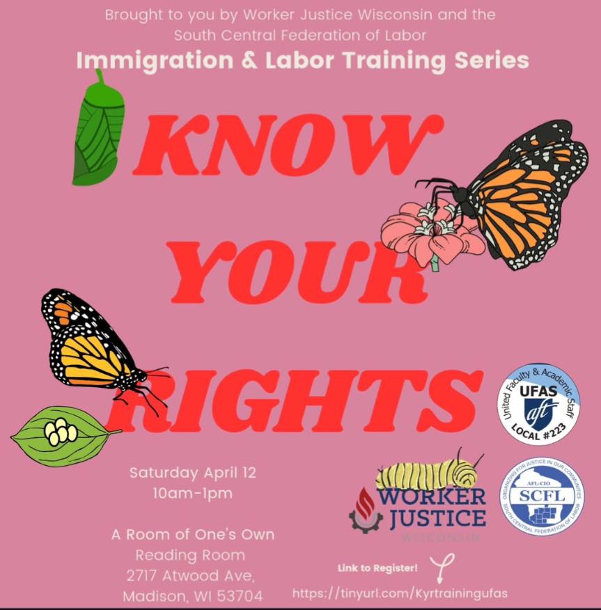 Categories Uncategorized Madison, April 12, 2025: Immigration & Labor Training Series: ‘Know Your Rights’ Post author By WiBOPM Post date April 8, 2025 Worker Justice Wisconsin Share this: Click to share on X (Opens in new window) X Click to share on Facebook (Opens in new window) Facebook Like Loading... Related ← Meriter RN’s Hold Strike Ready Rally in Madison with Strong Labor and Community Support → Madison, April 21, 2025: May Day Fundraiser