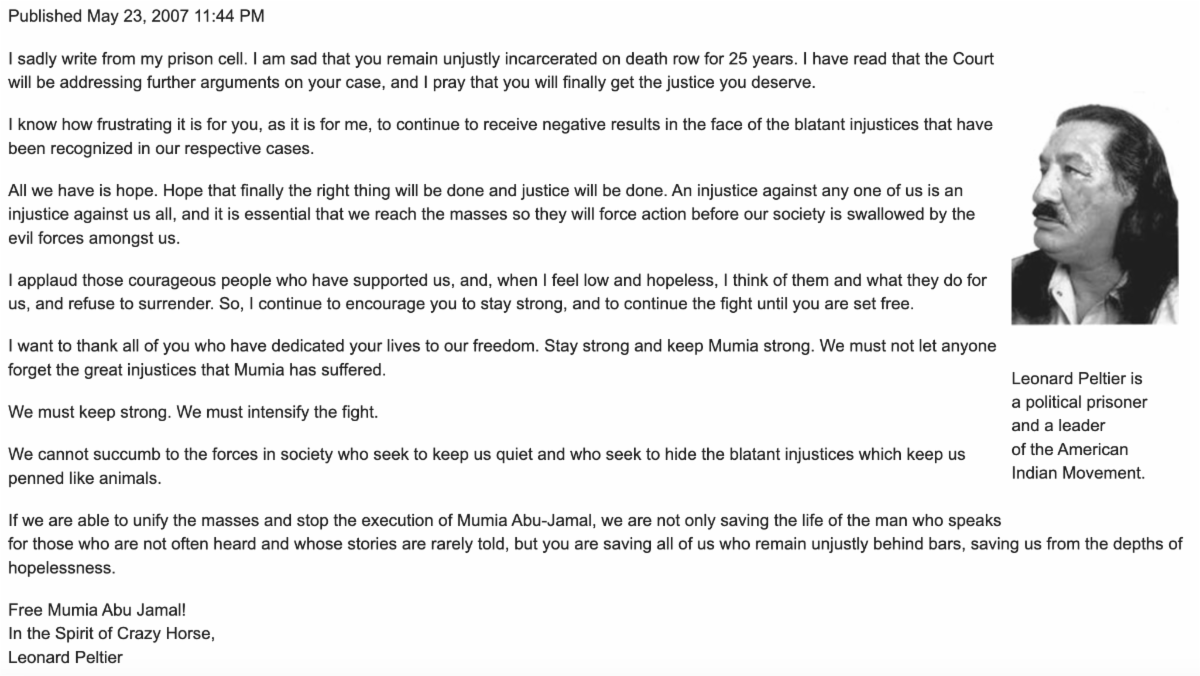 | “We are men in similar situations, men who fought for justice only to be persecuted by the system, a system that could not silence us. We have both been targeted by the FBI for neutralization. We are both victims of COINTELPRO. So many African and Native brothers and sisters have been victimized. When does it stop? What kind of world are our children facing?” – Statement in Solidarity with Mumia Abu-Jamal by Leonard Peltier, 6/20/1995 |