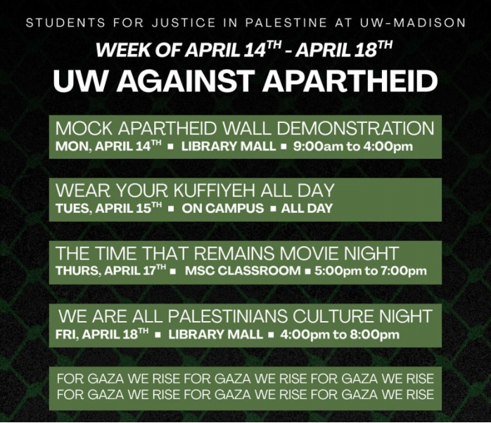 Categories Uncategorized Students for Justice in Palestine at UW-Madison: April 14-18, 2025: UW Against Apartheid! Post author By WiBOPM Post date April 11, 2025 Share this: Share on X (Opens in new window) X Share on Facebook (Opens in new window) Facebook Like Loading... Related ← Oshkosh, WI: UAW Local 291 Receives Strike Solidarity Contributions from Madison and Beyond! → Defeating the IHRA witch hunt: An interview with Palestinian activist and scholar Shahd Abusalama