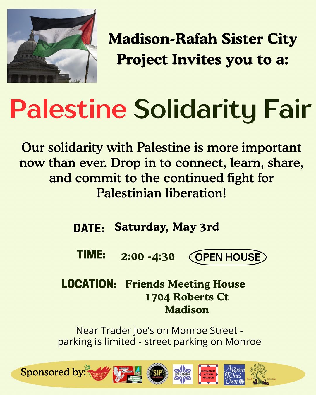 Categories Uncategorized Madison, May 3, 2025: Palestine Solidarity Fair Post author By WiBOPM Post date April 17, 2025 Madison-Rafah Sister City Project Share this: Click to share on X (Opens in new window) X Click to share on Facebook (Opens in new window) Facebook Like Loading... Related ← World Federation of Trade Unions May Day 2025 Declaration → NATO: What You Need to Know