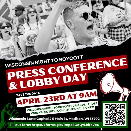 On Wednesday, April 23, members and supporters of the Wisconsin Right to Boycott Campaign will meet at the State Capitol to lobby our representatives to support new legislation to restore our right to boycott. There will be a press conference in the Capitol at 9:30 am, followed by pre-arranged meetings with representatives through 2-3 pm. The day will close with a rally to protect our voices, our democracy, and our country. WE NEED YOU TO JOIN US! Thanks for your support, Barb O. of MRSCP http://www.madisonrafah.org