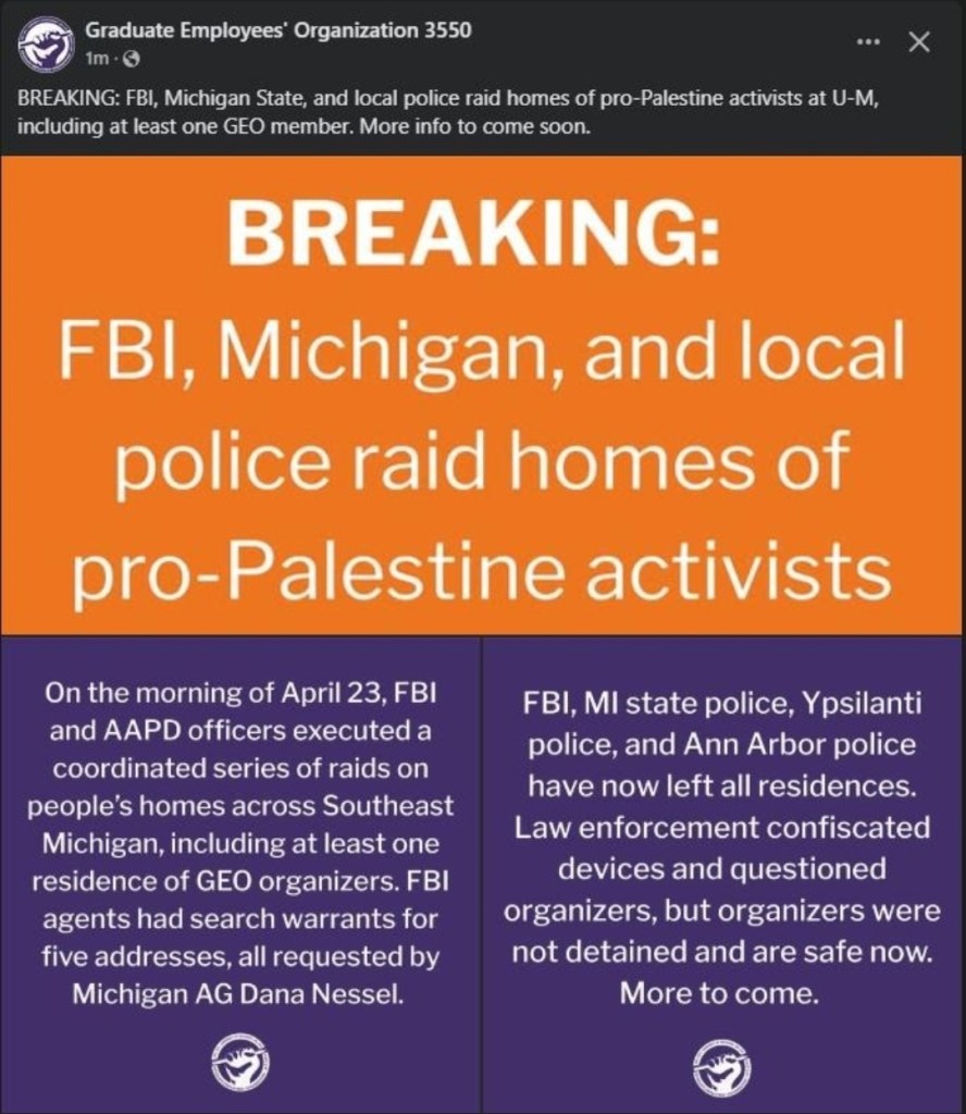 Categories Uncategorized FBI, Michigan and Local Police Raid Homes of Pro Palestinian Activists Post author By WiBOPM Post date April 23, 2025 Share this: Click to share on X (Opens in new window) X Click to share on Facebook (Opens in new window) Facebook Like Loading... Related ← Manitowoc, WI May Day, 2025! – Rally & March, ‘We Are the Many’ → Trump’s War on Earth-Too Hot to Handle!