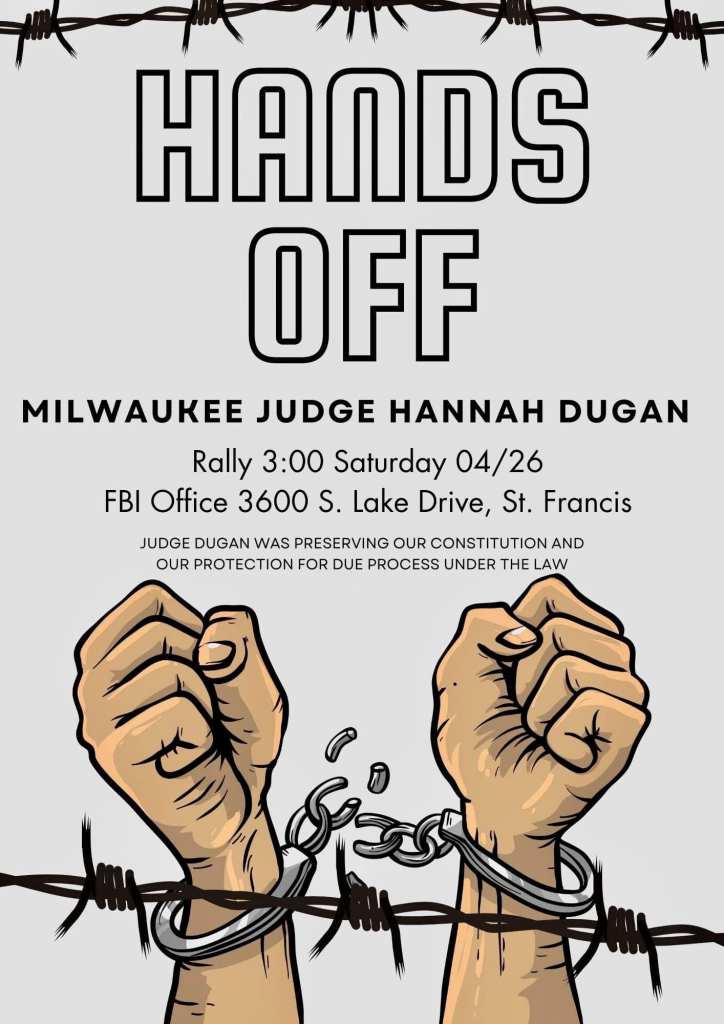 Categories Uncategorized St. Francis, WI, April 26, 2025: Hands Off Judge Hannah Dugan! – No Human Being Is Illegal! Protest ICE/FBI Illegal Actions! Post author By WiBOPM Post date April 25, 2025 Share this: Share on X (Opens in new window) X Share on Facebook (Opens in new window) Facebook Like Loading... Related ← Oshkosh May Day 2025! → Milwaukee/Wisconsin: People’s Forces Respond Immediately to ICE/FBI Attacks on Judge Dugan and the Undocumented