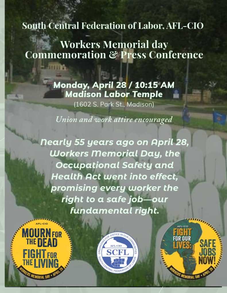 Categories Uncategorized Madison, April 28, 2025: Workers Memorial Day Commemoration & Press Conference Post author By WiBOPM Post date April 27, 2025 Share this: Click to share on X (Opens in new window) X Click to share on Facebook (Opens in new window) Facebook Like Loading... Related ← Milwaukee, May 4, 2025: 139th Anniversary Commemoration of Bay View Massacre → Kewaunee, WI May 3, 2025: People’s Protest