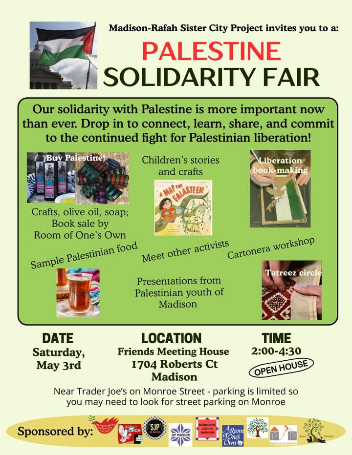 Drop in to connect, learn, share and commit to the continued fight for Palestinian liberation. Our solidarity with Palestine is more important now than ever. Contact: rafahsistercity@yahoo.com