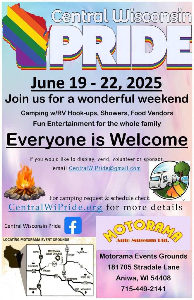 Categories Uncategorized Central Wisconsin Pride! June 19-22, 2025 Post author By WiBOPM Post date April 30, 2025 Share this: Click to share on X (Opens in new window) X Click to share on Facebook (Opens in new window) Facebook Like Loading... Related ← Trump’s tariffs: Prelude to shooting war? → Rights Groups Detail “Authoritarian” Reality of US Surveillance in Report to UN