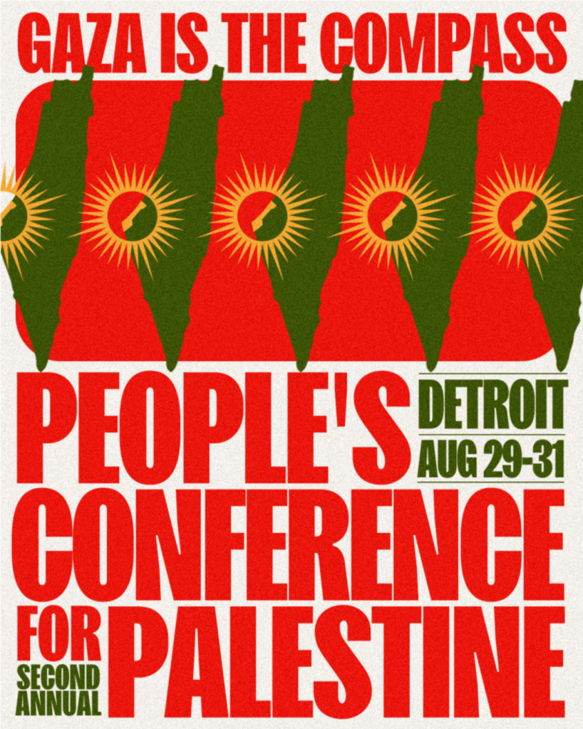 | Join us in Detroit, MI from August 29-31, 2025 for the second People’s Conference for Palestine: Gaza is the Compass. Gaza keeps our path true: it reminds us of our direction in the struggle and the sacrifices that have been made by the Palestinian people; it exposes the forces that we have to contend with on the path to liberation. For this reason, Zionism and imperialism are waging a continuous genocide on Gaza, and we, the people of the world, will fight at every turn to reject it. With Gaza as our guide, we aim to convene at this critical juncture to continue building and strengthening a mass movement in North America. Join us as organizations, collectives, movement leaders, community members, students and intellectuals, artists and cultural workers, and activists for a three-day convening to reflect, exchange, and strengthen ourselves and our fight for a free Palestine. The People’s Conference for Palestine will feature plenaries, workshops, art and cultural exhibits, and performances. |
