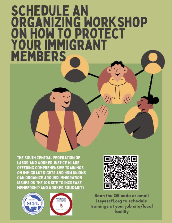 Categories Uncategorized Madison: Schedule An Organizing Workshop on How to Protect Immigrant Workers Post author By WiBOPM Post date May 1, 2025 https://www.scfl.org/ Share this: Click to share on X (Opens in new window) X Click to share on Facebook (Opens in new window) Facebook Like Loading... Related ← Hands Off Medicaid! Town Hall May 10, 2025 in Madison → 2025 Workers Memorial Day Presented by the South Central Federation of Labor (SCFL)