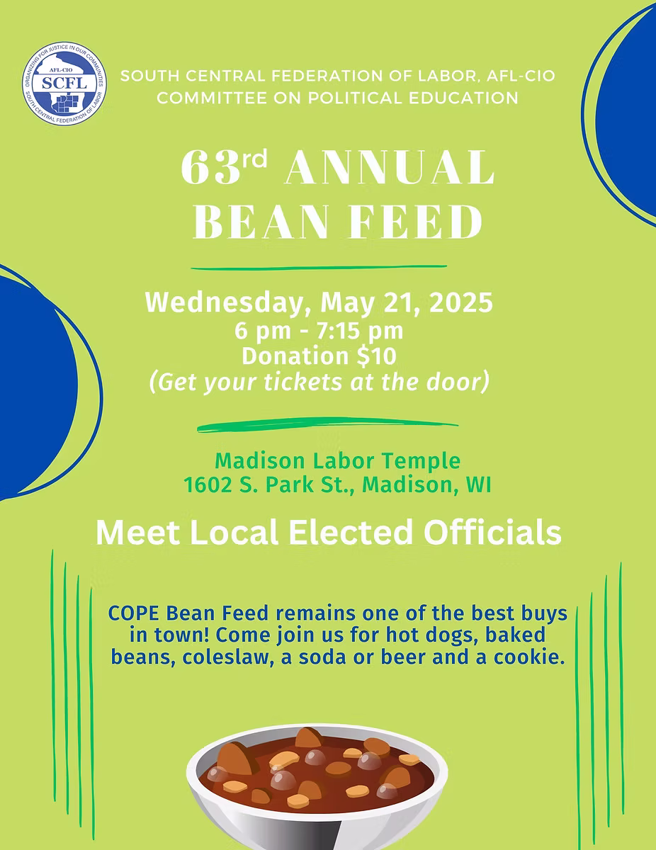 Categories Uncategorized Madison, May 21, 2025: 63rd Annual SCFL Bean Feed Post author By WiBOPM Post date May 10, 2025 https://www.scfl.org/ Share this: Share on X (Opens in new window) X Share on Facebook (Opens in new window) Facebook Like Loading... Related ← Madison, May 14, 2025: Save Our Services! – State Workers Rally → Oshkosh, June 14, 2025: Fundraiser for UAW 291 Strikers – Film Screening of ‘Pride’