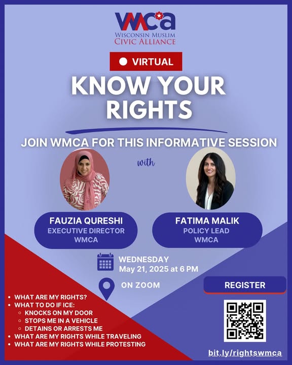 Categories Uncategorized ONLINE, May 21, 2025: WI Muslim Civic Alliance ‘Know Your Rights’ Training Post author By WiBOPM Post date May 10, 2025 Share this: Share on X (Opens in new window) X Share on Facebook (Opens in new window) Facebook Like Loading... Related ← People’s Resistance Wins Rumeysa’s Relase; Fight Continues → Madison, May 25, 2025: Film Screening of ‘No Other Land’
