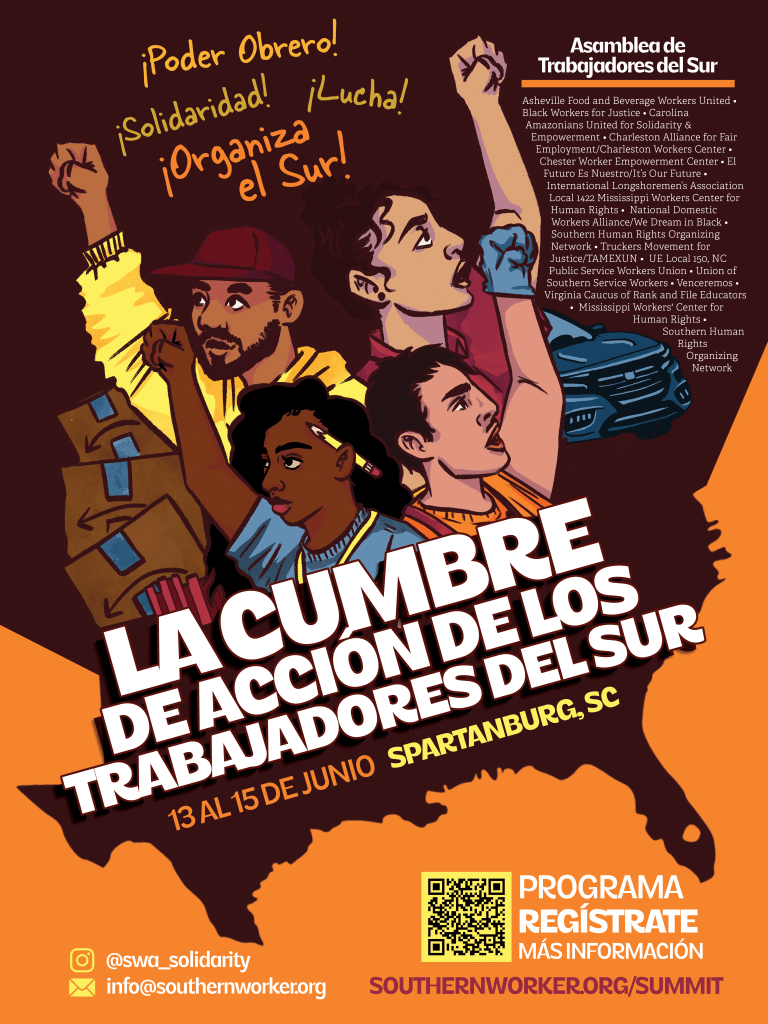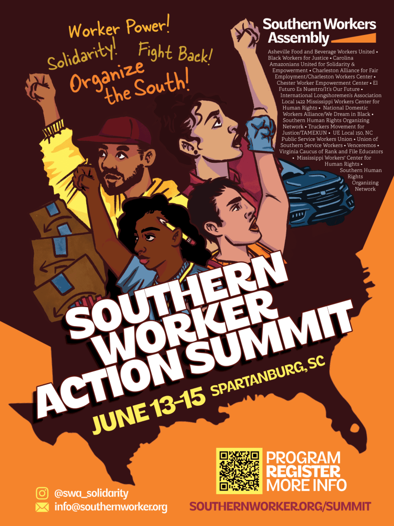 | The Trump administration and the billionaire class have made it clear: they are determined to dismantle our rights and our organizations, lower our quality of life by cutting programs like Medicaid and Social Security to fund tax cuts for the rich and a $1 trillion defense budget, to roll back every measure of progress won through struggle over the last century, and will try to do everything they can to divide us. The U.S. South is the least unionized region of the country, a bulwark of right to work and anti-labor laws. All of the Southern states combined have the same number of union members as the state of New York alone. The region plays a unique role in shaping systemic racism and white supremacy in the U.S. – from slavery, to Jim Crow, to today. It is dominated by some of the most reactionary and backwards forces in the country. Nearly 60% of Black workers in the U.S. live in the South, and the region has the fastest growing population of migrant workers. A new type of workers movement is needed to confront the challenges the working class faces today, one that is engaged in militant struggles that link our fights across workplaces together, and that is focused on building new forms of organization among the unorganized. The Southern Worker Action Summit will be the place to bring our experiences from fights in our workplaces and communities together to begin to lay the foundation for building a workers movement in the South that can do just that. On June 13 – 15, rank and file workers from sectors across Southern states will gather in Spartanburg, SC, discuss, debate, exchange, train, and strategize about how to build an independent, fighting workers movement in the U.S. South. Throughout the weekend, there will be many opportunities for exchanges and strategy discussions among workers in large and small group discussions, sector and state strategy breakouts, trainings and political education sessions, setting out plans to build mass workplace actions on May Day 2028, and more. Sixteen worker organizations building power with workers in key sectors of the economy have worked together to develop the Summit, and we’ll be joined by delegations from workers assemblies, unions, and international workers organizations who will all contribute to the programming and strategy discussions that will take place throughout. Take a look at what’s planned, get general information on the weekend, and register to attend here: https://southernworker.org/summit |