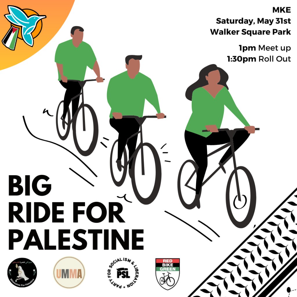 Categories Uncategorized Milwaukee, May 31, 2025: Big Ride for Palestine Post author By WiBOPM Post date May 29, 2025 Share this: Click to share on X (Opens in new window) X Click to share on Facebook (Opens in new window) Facebook Like Loading... Related ← PFLP: U.S.-zionist ‘aid-distribution centers’ are mass-death traps and a tool for forced displacement → Media Advisory: Meriter Nurses Will March to Wisconsin Capitol On Day 4 of Historic Strike for Safe Staffing and Workplace Security