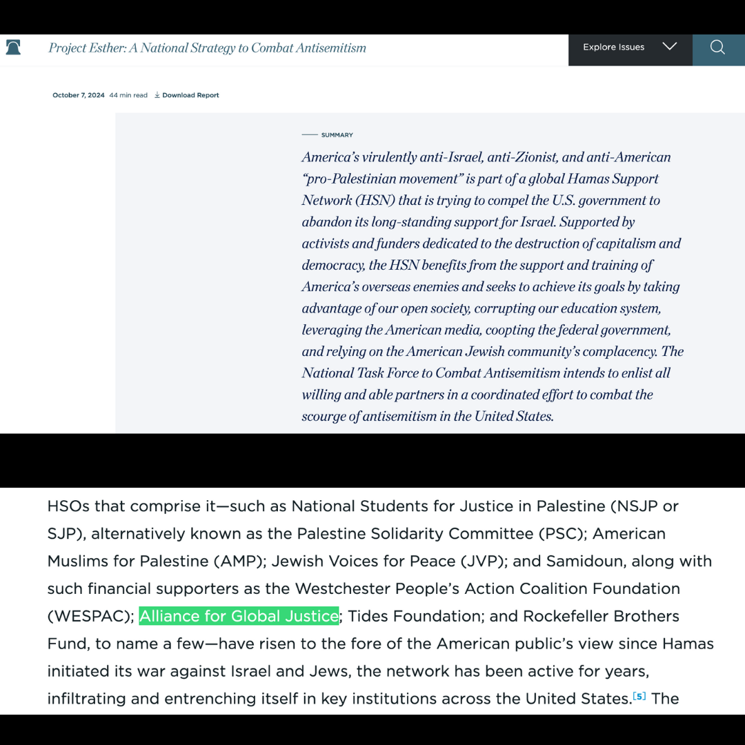 As part of this smear, criminalization, and intimidation campaign against any voice opposing current IDF’s massacres – which to date have claimed the lives of more than 52,000 Palestinians -the Alliance for Global Justice has been accused, along with other organizations, of being part of a group that Project Esther’s authors Victoria Coates, Daniel Flesch and Robert Greenway have dubbed the Hamas Support Network (HSN). As a consequence of right wing harassment, AFGJ has been going through a deplatform campaign (credit card companies won’t process our online donations), threatened with legal action for exercising the most fundamental rights, such as freedom of speech, due to our support to Palestinian-led solidarity organizations. Some of our members have even been harassed by law enforcement agents to stop their current work.