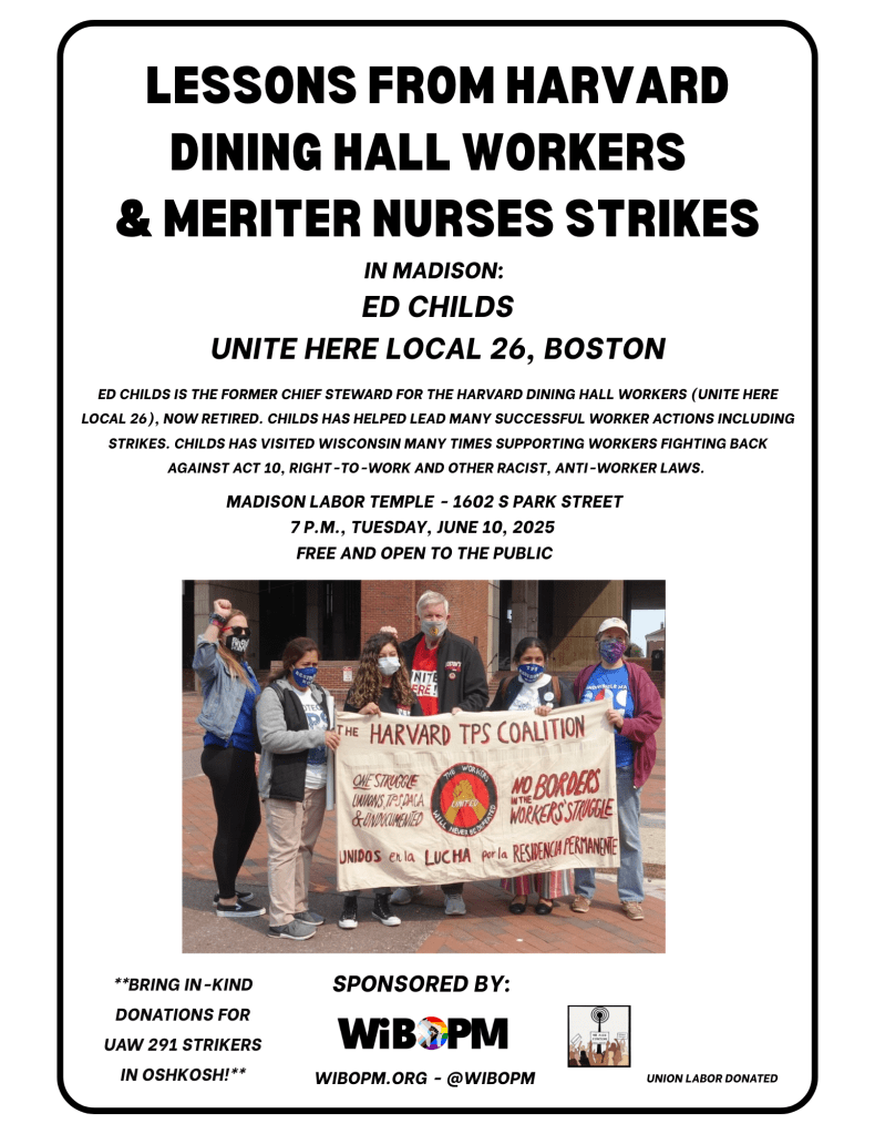 Ed childs is the former Chief Steward for the Harvard dining hall workers (UNITE HERE Local 26), now retired. Childs has helped lead many successful worker actions including strikes. Childs has visited Wisconsin many times supporting workers fighting back against Act 10, right-to-work and other racist, anti-worker laws.