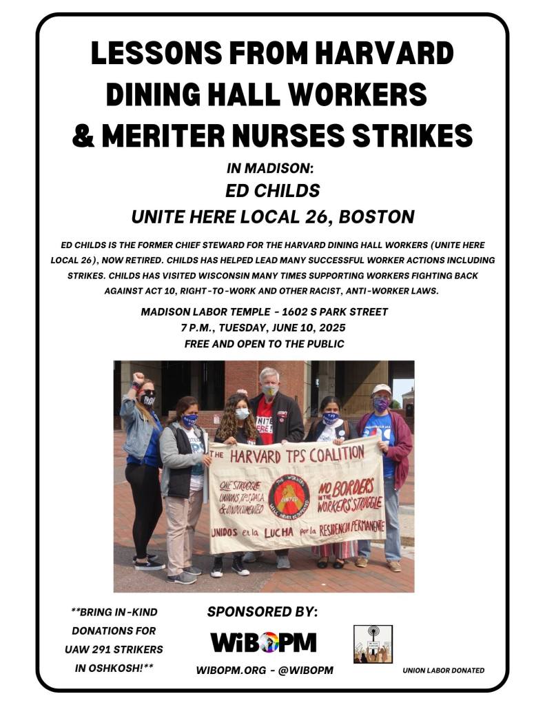 Categories Uncategorized Madison, June 10, 2025: Ed Childs – ‘Lessons of Harvard Dining Hall Workers & Meriter Nurses Strikes’ Post author By WiBOPM Post date June 6, 2025 Wisconsin Bail Out The People Movement Facebook Event: https://www.facebook.com/share/16Z9pCadLD/ We Rise Fighting – Labor Podcast Share this: Share on X (Opens in new window) X Share on Facebook (Opens in new window) Facebook Like Loading... Related ← Oshkosh, June 14, 2025: ‘Pride’ Film Screening Fundraiser for UAW 291 Strikers → SoCal: SEIU 721 President Assaulted and Detained by ICE; People’s Fightbacks Continue!