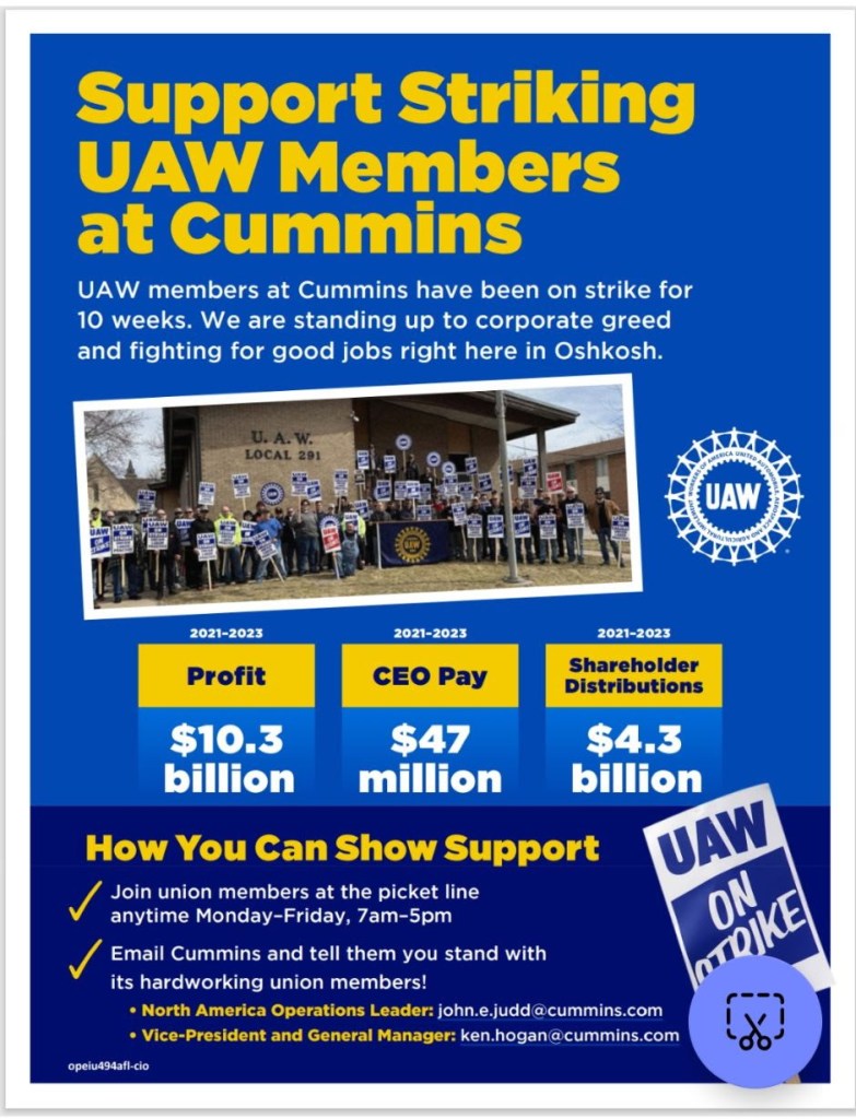 UAW Local 291 members at Cummins in Oshkosh have been on strike since March 18. They are standing strong and have rejected two unacceptable contract offers. Cummins continues to bargain in bad faith and there has been a charge filed with the NLRB.