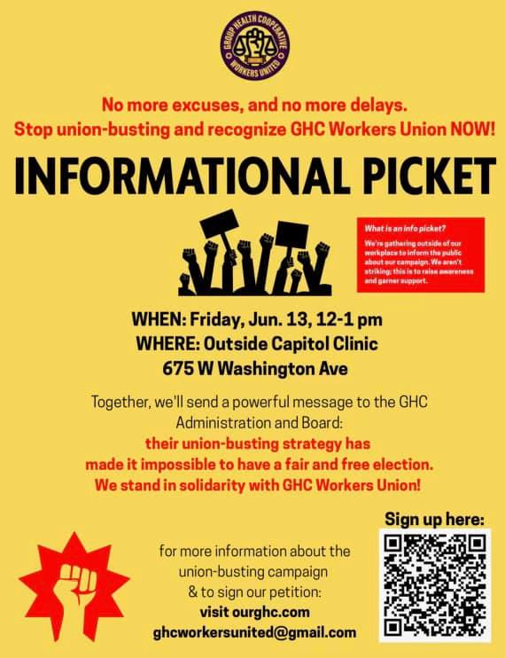 Categories Uncategorized SEIU Wisconsin – Group Health Cooperative Workers United Informational Picket June 13, 2025 Post author By WiBOPM Post date June 9, 2025 SEIU Wisconsin Share this: Share on X (Opens in new window) X Share on Facebook (Opens in new window) Facebook Like Loading... Related ← Abolish NATO Now! – June 15, 2025 UNAC Webinar → Basic Field First Aid for Protest Attendees