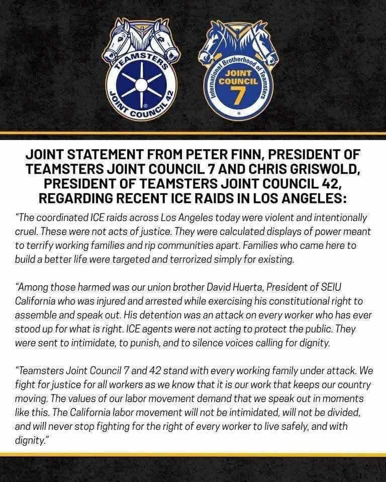 Categories Uncategorized Teamsters Joint Councils 7 and 42: Solidarity With Migrants! – Stop ICE! Post author By WiBOPM Post date June 10, 2025 Share this: Click to share on X (Opens in new window) X Click to share on Facebook (Opens in new window) Facebook Like Loading... Related ← We Rise Fighting! Labor Podcast – E114: CBTU Statement and SEIU Nurses on Strike in Madison, WI → Save the Dates: Milwaukee, July 8-9,2025 Judge Dugan Pre-Trial Watch