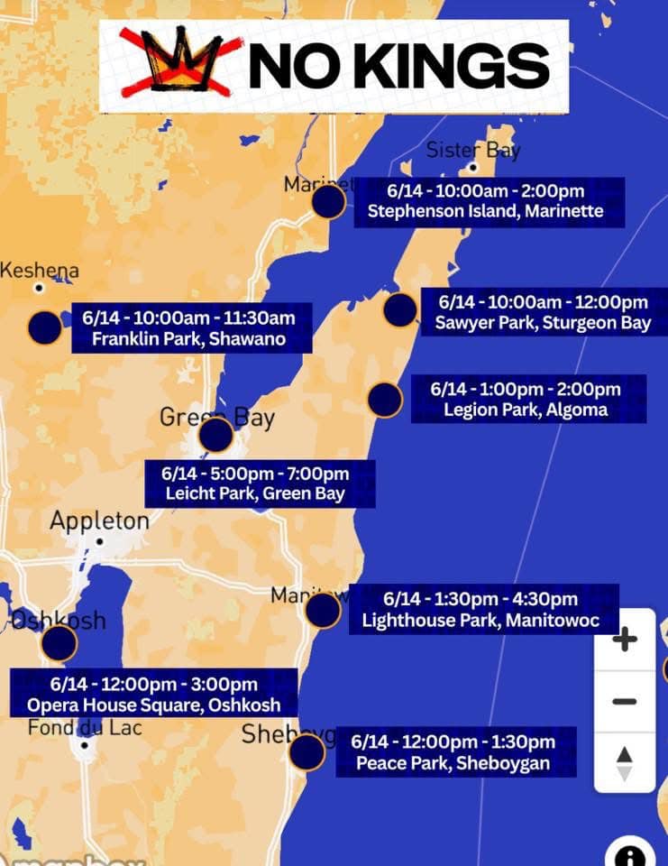 Categories Uncategorized Northeastern Wisconsin: No Kings Protests June 14, 2025 Post author By WiBOPM Post date June 12, 2025 Share this: Share on X (Opens in new window) X Share on Facebook (Opens in new window) Facebook Like Loading... Related ← Harriet Tubman Center L.A.: Stay in the Street! No Curfew! ICE, National Guard, Marines, LAPD – OUT of Los Angeles! End the Occupation! → No U.S. War On Iran!