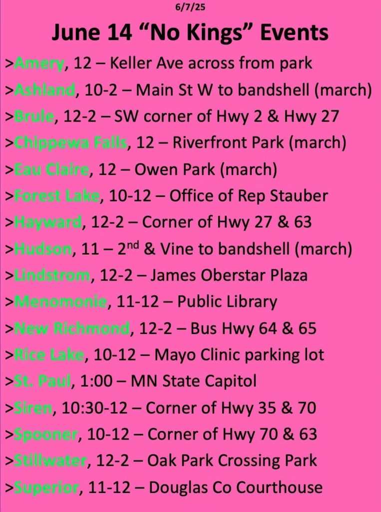 Categories Uncategorized Wisconsin, June 14, 2025: ‘No Kings’ Protests (City Listings) Post author By WiBOPM Post date June 12, 2025 https://www.nokings.org/ ‘No Kings’ protests will be held in communities across Wisconsin Saturday Share this: Share on X (Opens in new window) X Share on Facebook (Opens in new window) Facebook Like Loading... Related ← Boston, June 20, 2025: Rally for HIV/AIDS Funding with Act Up & Boston Liberate Pride → No U.S.-Israel War On Iran!