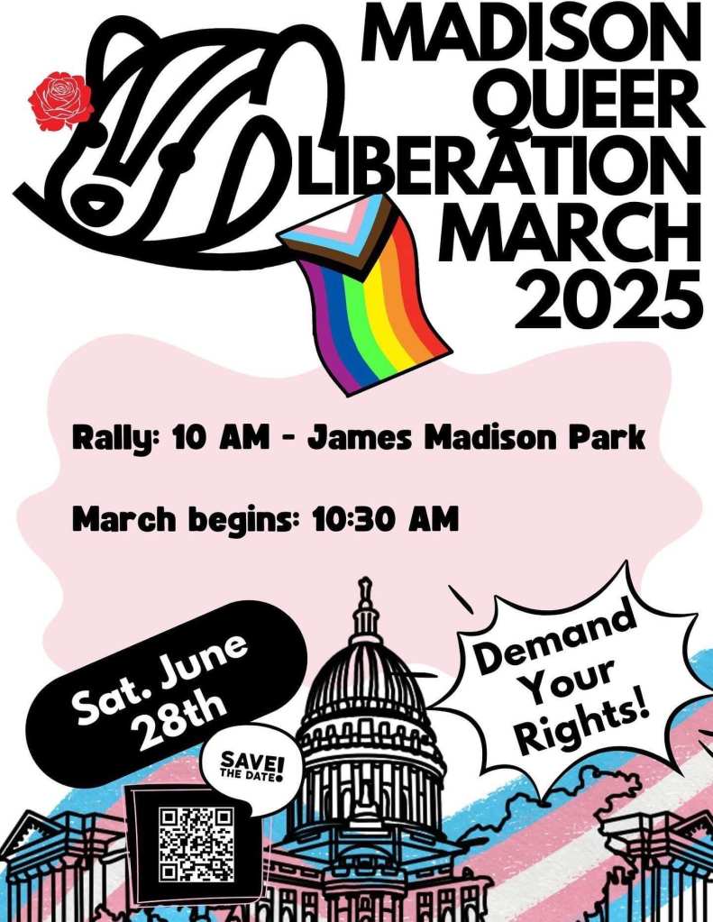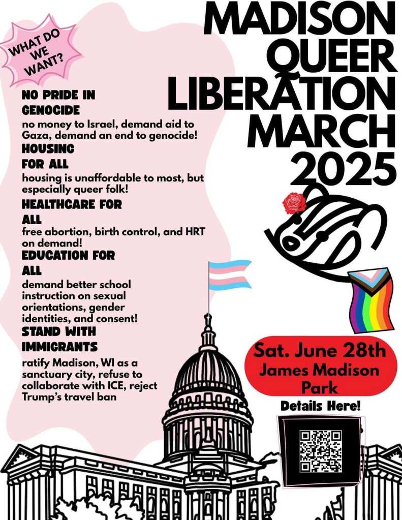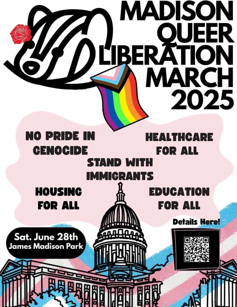 Categories Uncategorized Madison, June 28, 2025: Queer Liberation March (with Anti-War Contingent) Post author By WiBOPM Post date June 24, 2025 Event: https://www.facebook.com/share/1FkNMSFJ1o/ Share this: Click to share on X (Opens in new window) X Click to share on Facebook (Opens in new window) Facebook Like Loading... Related ← Veterans For Peace Condemns U.S. Attack on Iran Calls for Nationwide Protests → Madison, June 27, 2025: Free HIV Testing at Community Pharmacy