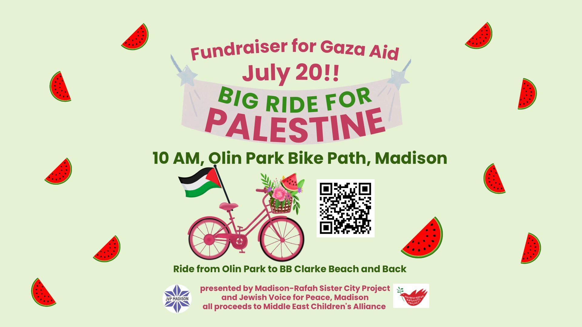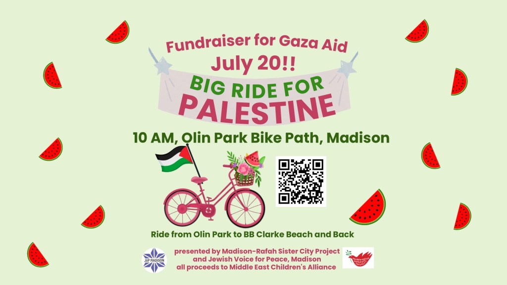 Registration is now open for the Annual Big Ride for Palestine, set for Sunday, July 20. Register by July 15 to be sure to receive your T-shirt. Help us support the vital Gaza relief work of the Middle East Children’s Alliance; all details including registration link and instructions here.