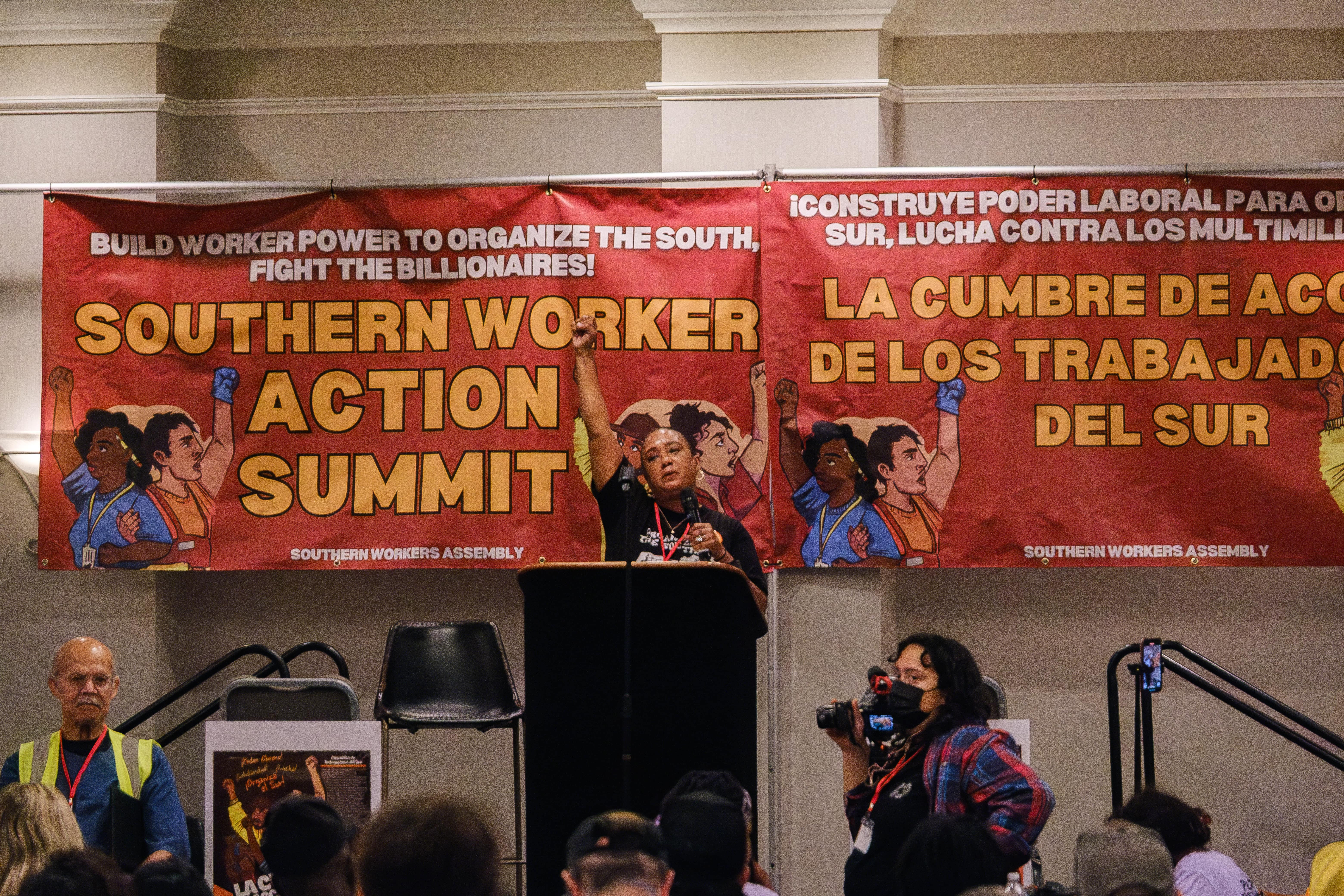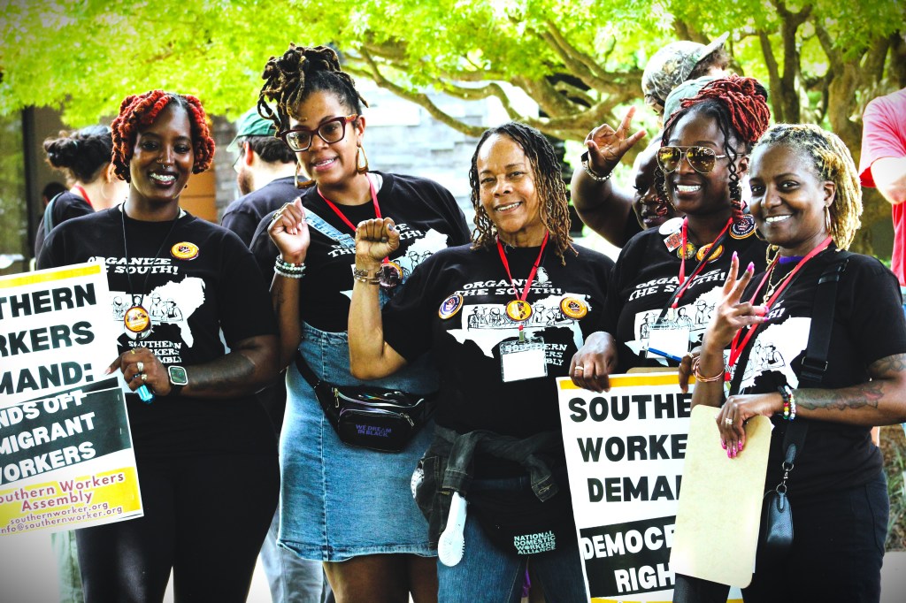 | Organize the South, Fight the Billionaires The Southern Worker Action Summit was developed to not only be a space for training, political education discussions, strategic and tactical exchanges, and building connections among workers throughout the region, but to also advance concrete organizational and action initiatives. “To withhold our labor puts the hurt on the capitalists, and it all starts with two or three workers in each workplace, the militant minority,” Abdul Alkalimat, chair of the SWA Political Education Committee, explained in his opening comments, motivating this orientation. “They have power, but we have to take it from them. That’s the workers assemblies, many workplaces connected together across a city. We get there by blitzing…salting…and looking for those few workers, the militant minority, who can spark workplace struggles.” To that end, some of the key outcomes of the Summit include: The creation or consolidation of industrial councils in various sectors, including education, gig workers, manufacturing, logistics, public sector, healthcare, and others The formation of state groupings of workers assemblies and worker organizations that are oriented towards conducting coordinated workplace blitzes, identifying strategic industries for workers to get hired into to organize, and planning for state-level worker meetings in late 2025 and early 2026 Initial steps to concretize the 16 convening worker organizations and other participating groups into an ongoing formation to raise the ability of workers across the region to coordinate, make interventions, identify organizing priorities, and begin developing plans for mobilizing unorganized workers to participate in May Day 2028 activities The expansion of the SWA political education committee and development of plans to produce studies on the political economy of various Southern states to inform organizing strategies Agreement to make coordinated efforts to engage unorganized workers to participate in mass demonstrations against the billionaire attacks, and raising a more visible presence of Southern workers in those mobilizations The response to the Summit and the various outcomes it was able to advance demonstrate clearly that a combative mood is widespread among workers across industries and states throughout the region. The challenge now is how to coordinate, organize, and channel that fighting spirit into a unified effort to build organization and a broader workers movement. A chant that closed the Summit summed up the weekend and set the direction very clearly: “Workers want power, organize the South!” Southern Worker Action Summit Co-Conveners: Asheville Food and Beverage Workers United; Black Workers for Justice; Carolina Amazonians United for Solidarity & Empowerment; Charleston Alliance for Fair Employment/Charleston Workers Center; Chester Worker Empowerment Center; El Futuro Es Nuestro/It’s Our Future; International Longshoremen’s Association Local 1422; Mississippi Workers Center for Human Rights; National Domestic Workers Alliance/We Dream in Black; Southern Human Rights Organizing Network; Truckers Movement for Justice/TAMEXUN; UE Local 150, NC Public Service Workers Union; Union of Southern Service Workers; Venceremos; Virginia Caucus of Rank and File Educators |