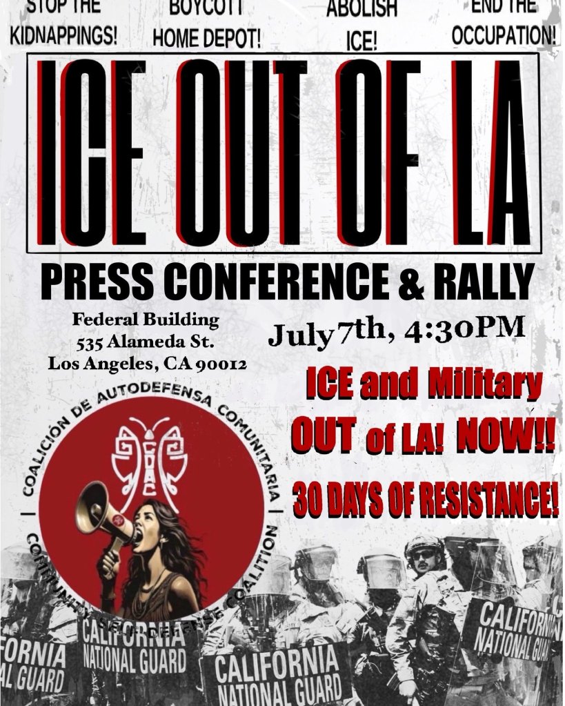 Unión del Barrio – Los Ángeles – Tomorrow makes 30 days of the militarized assault on Los Angeles. Join us at this action to continue to demand that the kidnappers and the US military get OUT of our city! MAGA colonial fascism thought that bringing in the military would scare us and that the protests would stop but we have proven that we have continued the resistance and we are NOT going to stop until the kidnappings stop! Que viva la resistencia! Unión del Barrio is a proud member of the Community Self-Defense Coalition!