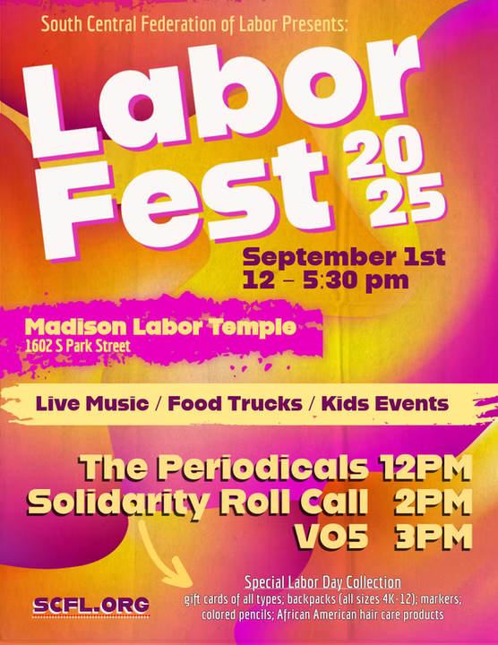 Categories Uncategorized Madison, September 1, 2025: Labor Fest! Post author By WiBOPM Post date July 11, 2025 https://www.scfl.org/ Share this: Click to share on X (Opens in new window) X Click to share on Facebook (Opens in new window) Facebook Like Loading... Related ← Madison, July 17, 2025: Mr. John Lewis: Commemorative Cookout Celebration → Watertown, July 17, 2025: ‘Good Trouble Lives On!’ – Mr. John Lewis National Day of Action Event