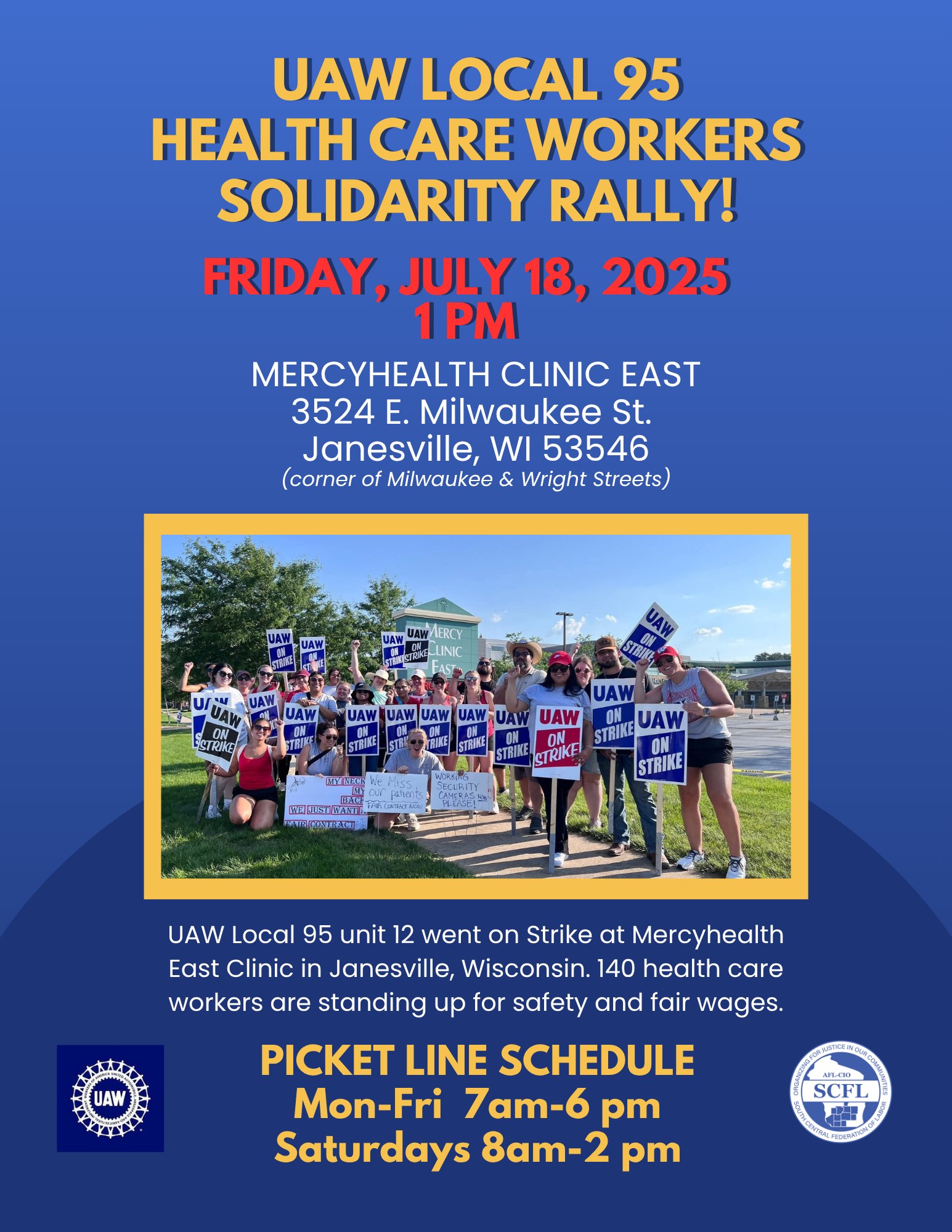 Categories Uncategorized UAW Local 95 Healthcare Workers Solidarity Rally in Janesville July 18, 2025! Post author By WiBOPM Post date July 16, 2025 UAW Local 95 Use the QR code to contribute to the strike fund or use this link: https://donorbox.org/support-strikers-at-local-_____-3-2… Share this: Click to share on X (Opens in new window) X Click to share on Facebook (Opens in new window) Facebook Like Loading... Related ← UAW Local 95 Strike Fund – Make a Contribution Today! → Hotel workers are unionizing at the Hilton Madison Monona Terrace!