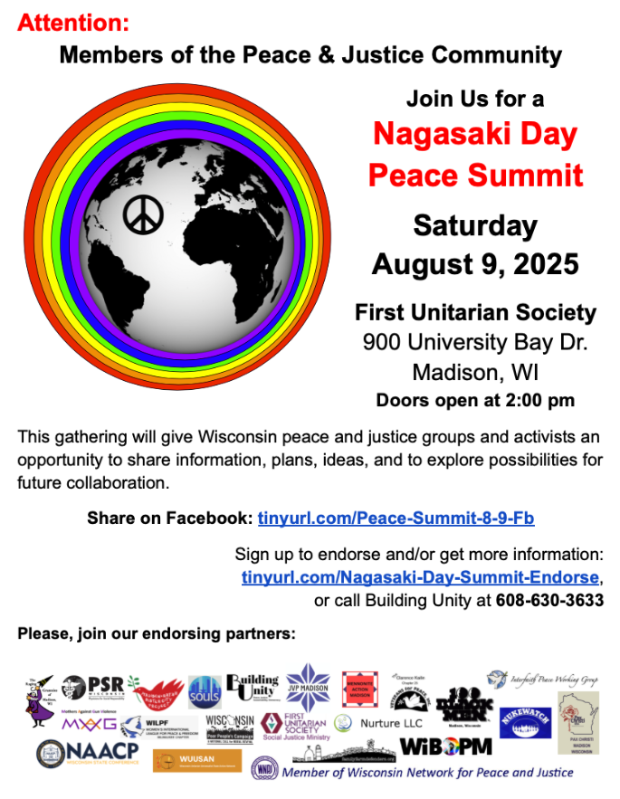 Categories Uncategorized Madison, August 9, 2025: Nagasaki & Hiroshima Peace Summit Post author By WiBOPM Post date July 21, 2025 Share this: Click to share on X (Opens in new window) X Click to share on Facebook (Opens in new window) Facebook Like Loading... Related ← US INTERVENTION AND SALVADORAN RESISTANCE from ARENA to Bukele → Madison, July 25 and 26, 2025: Dr. Feroze Sidhwa, ‘The Ongoing Health Catastrophe in Gaza’