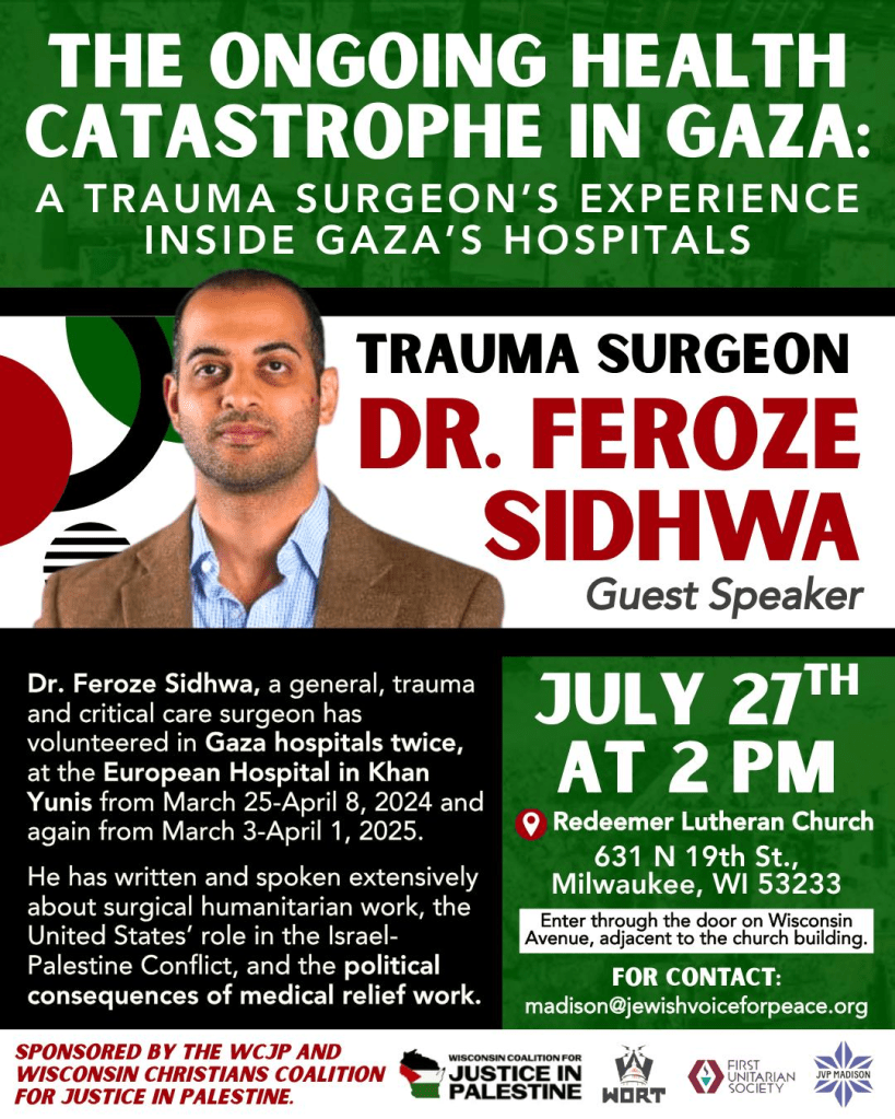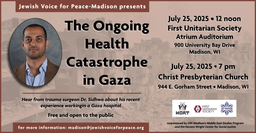 Dr. Sidhwa’s visit to Madison is sponsored by Jewish Voice for Peace-Madison and co-sponsored by the Middle East Studies Program at UW-Madison, the Havens Wright Center for Social Justice, First Unitarian Society, Christ Presbyterian Church, Madison for World Beyond War and Madison-Rafah Sister City Project.