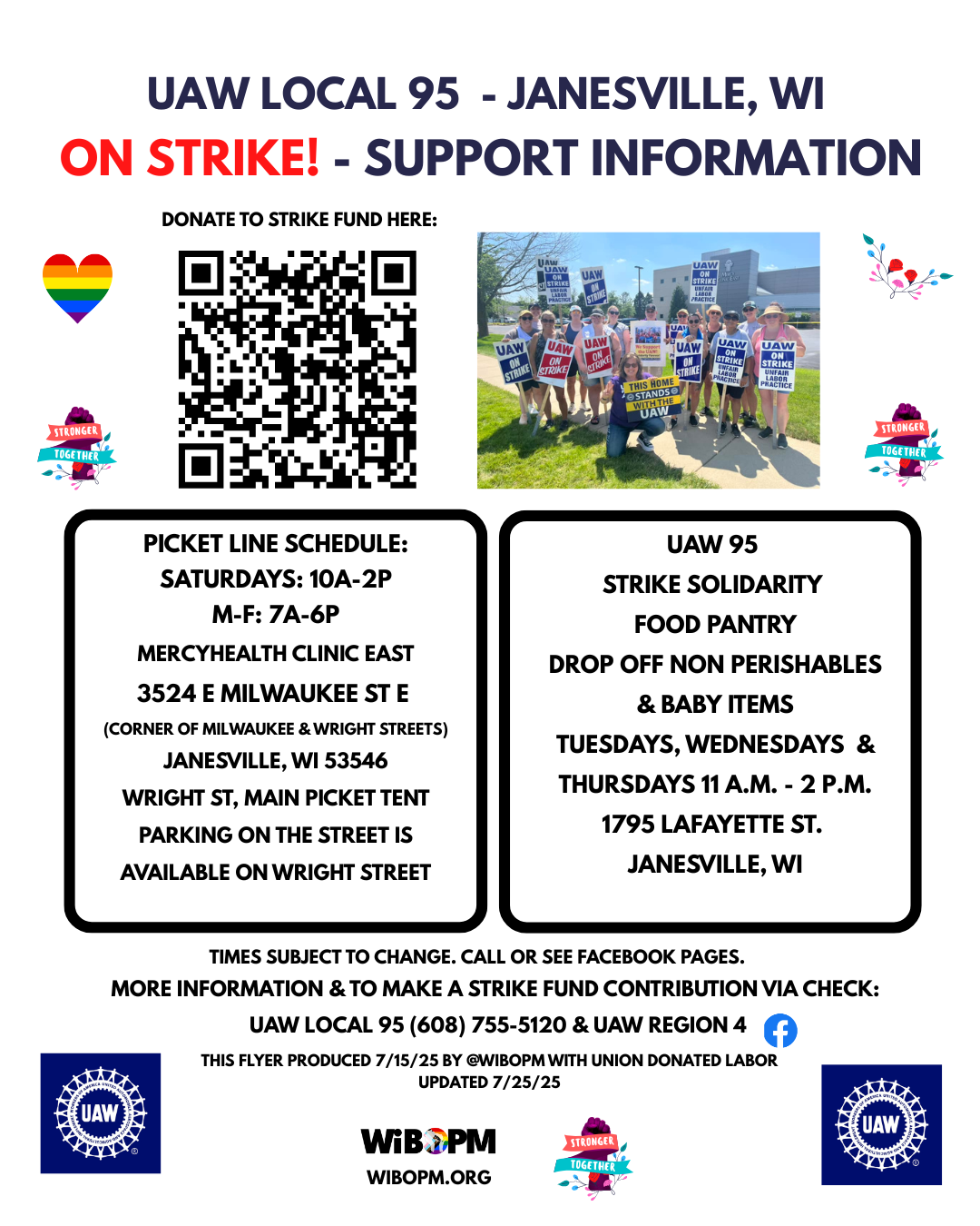 Categories Uncategorized Janesville, WI: UAW 95 Still On Strike! – Flyer With Updated Info Post author By WiBOPM Post date July 25, 2025 UAW Local 95 – UAW Region 4 Share this: Click to share on X (Opens in new window) X Click to share on Facebook (Opens in new window) Facebook Like Loading... Related ← Warning: Ron Johnson Votes to Cut Medicaid, SNAP and Other Safety Nets! → Baltimore hospital nurses make history with first-ever strike
