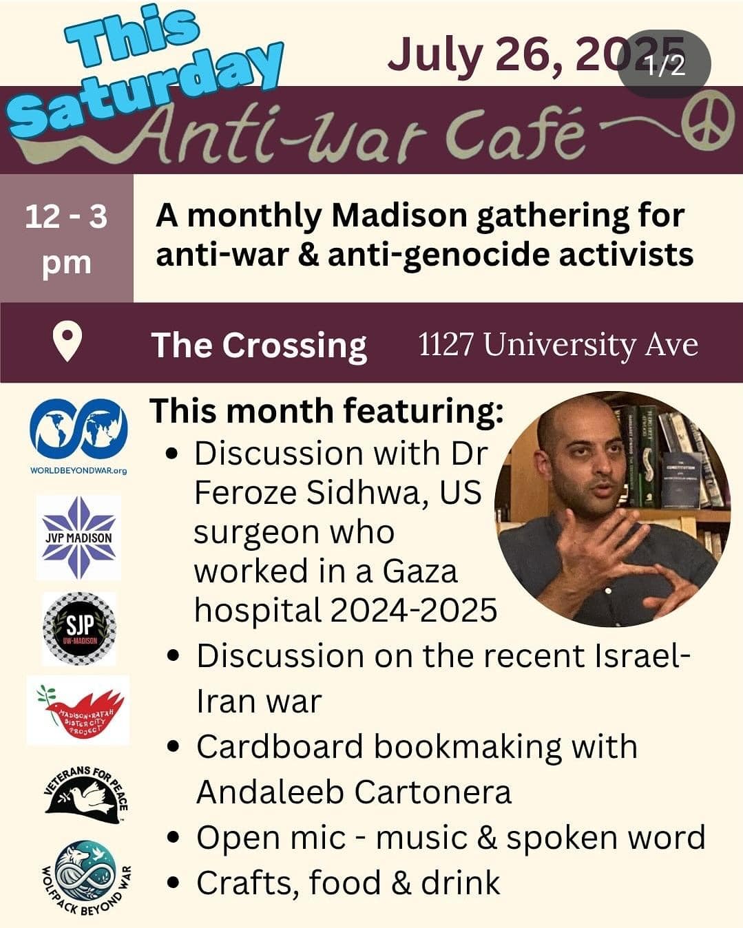 Categories Uncategorized Madison, July 26, 2025: Anti-War Cafe Post author By WiBOPM Post date July 25, 2025 Share this: Click to share on X (Opens in new window) X Click to share on Facebook (Opens in new window) Facebook Like Loading... Related ← Milwaukee, July 26, 225: Families First – A National Day of People’s Action → July-September 2025: Black August with the BAP Solidarity Network