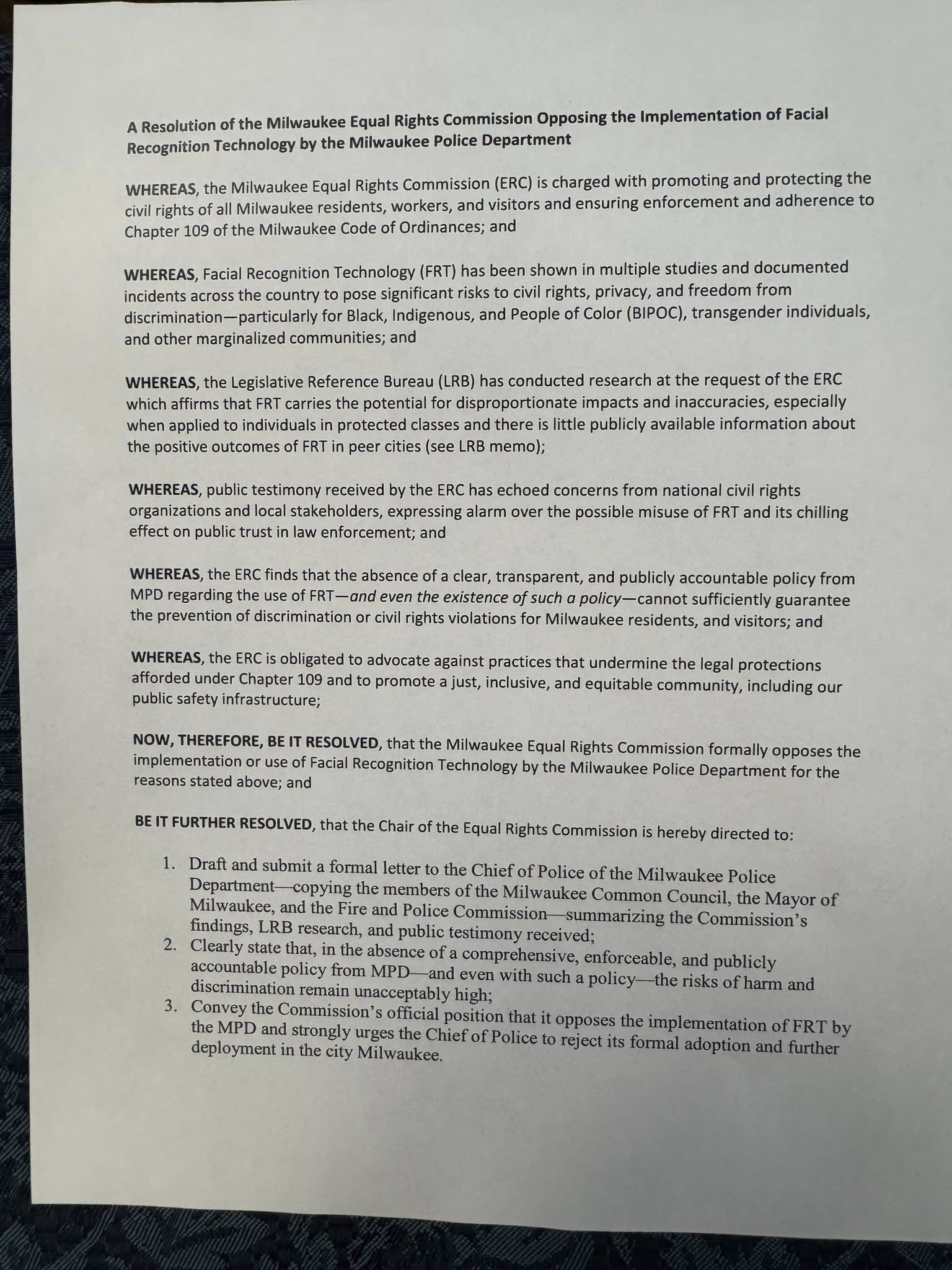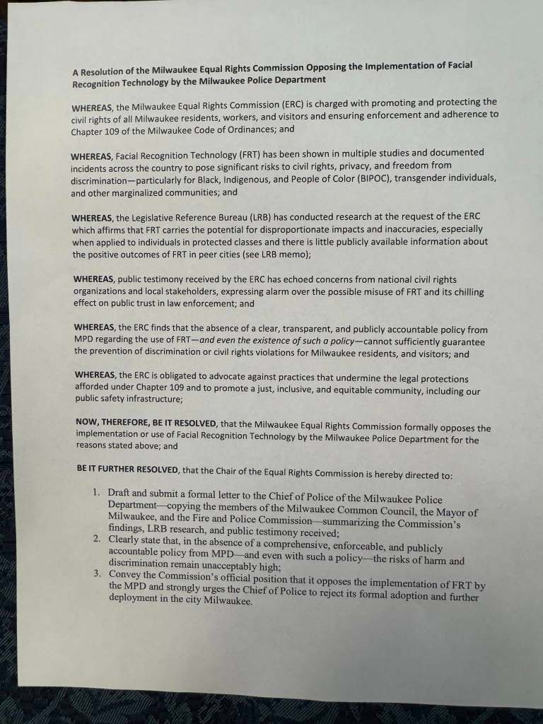A BIG victory today as the Equal Rights Commission – MKE unanimously passes a resolution opposing the use or implementation of Facial Recognition Technology by the Milwaukee Police Department.