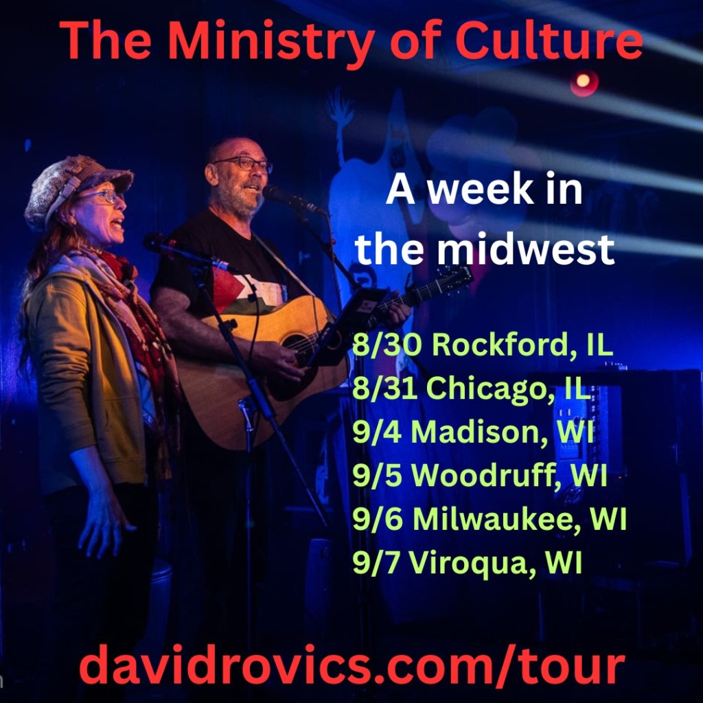 Info about all 6 gigs the Ministry of Culture will be doing in Illinois and Wisconsin between August 30 and September 7, 2025, can now be found at davidrovics.com/tour. Please spread the word if you know anybody in Illinois or Wisconsin!