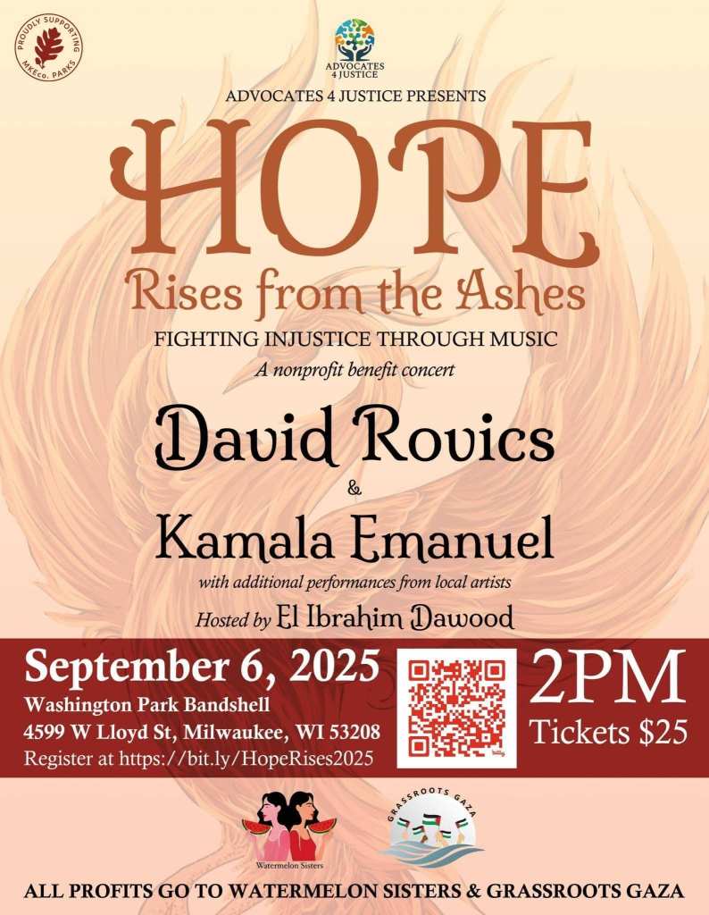 Categories Uncategorized Hope Rises From the Ashes – Fighting Injustice Through Music – A Benefit for Gaza with David Rovics Post author By WiBOPM Post date August 13, 2025 Share this: Share on X (Opens in new window) X Share on Facebook (Opens in new window) Facebook Like Loading... Related ← ACTIVIST GROUPS CONDEMN TRUMP TAKEOVER OF WASHINGTON DC → Milwaukee: Picnic With the Palestine Children’s Relief Fund (PCRF) August 16, 2025