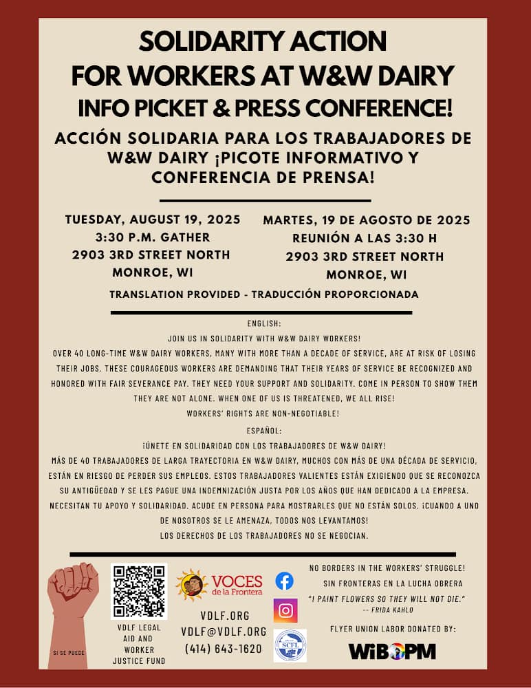 Categories Uncategorized Monroe, WI, August 19, 2025: Solidarity Action for Workers at W&W Dairy! Post author By WiBOPM Post date August 18, 2025 Voces de la Frontera Share this: Click to share on X (Opens in new window) X Click to share on Facebook (Opens in new window) Facebook Like Loading... Related ← Las Cafeteras in West Allis, WI August 29, 2025 – Voces de la Frontera Fundraiser → Racine, September 26, 2025: Fiesta Patrias – Community Celebration!